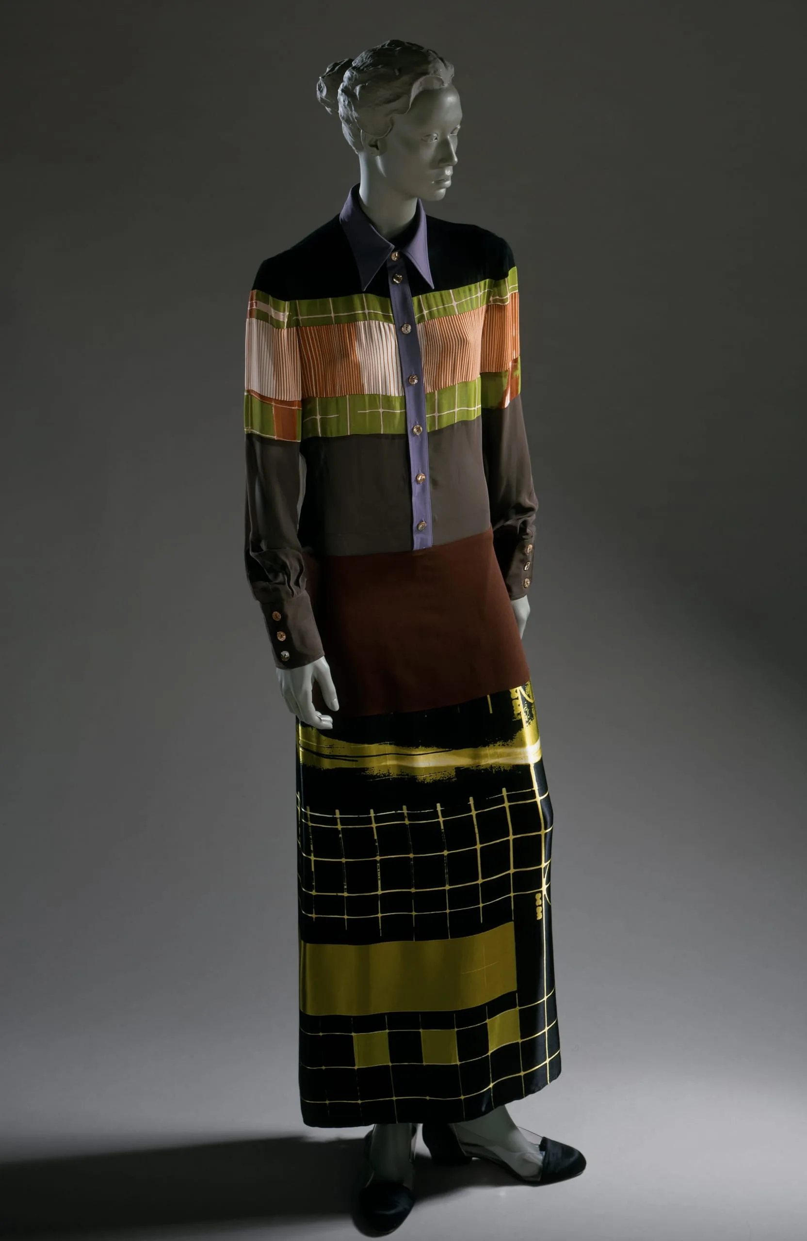 - Rayon plain weave (chiffon), rayon plain weave (chiffon, printed), rayon plain weave (crepe), rayon satin, printed, and mother-of-pearl buttons.