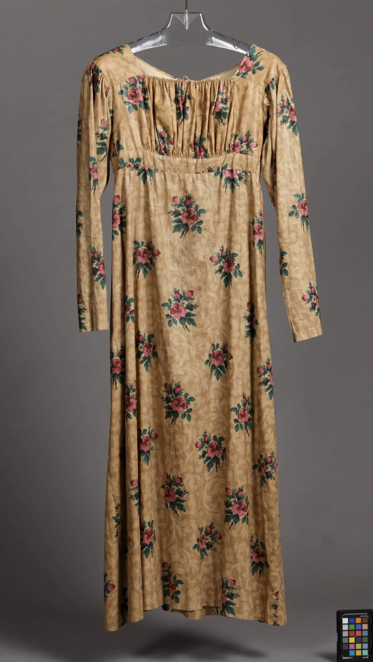 Full-length historical dress in golden-tan fabric with an allover repeating pink rose and green leaf bouquet print, high-waisted silhouette with gathered bodice and long fitted sleeves, displayed on a clear hanger
