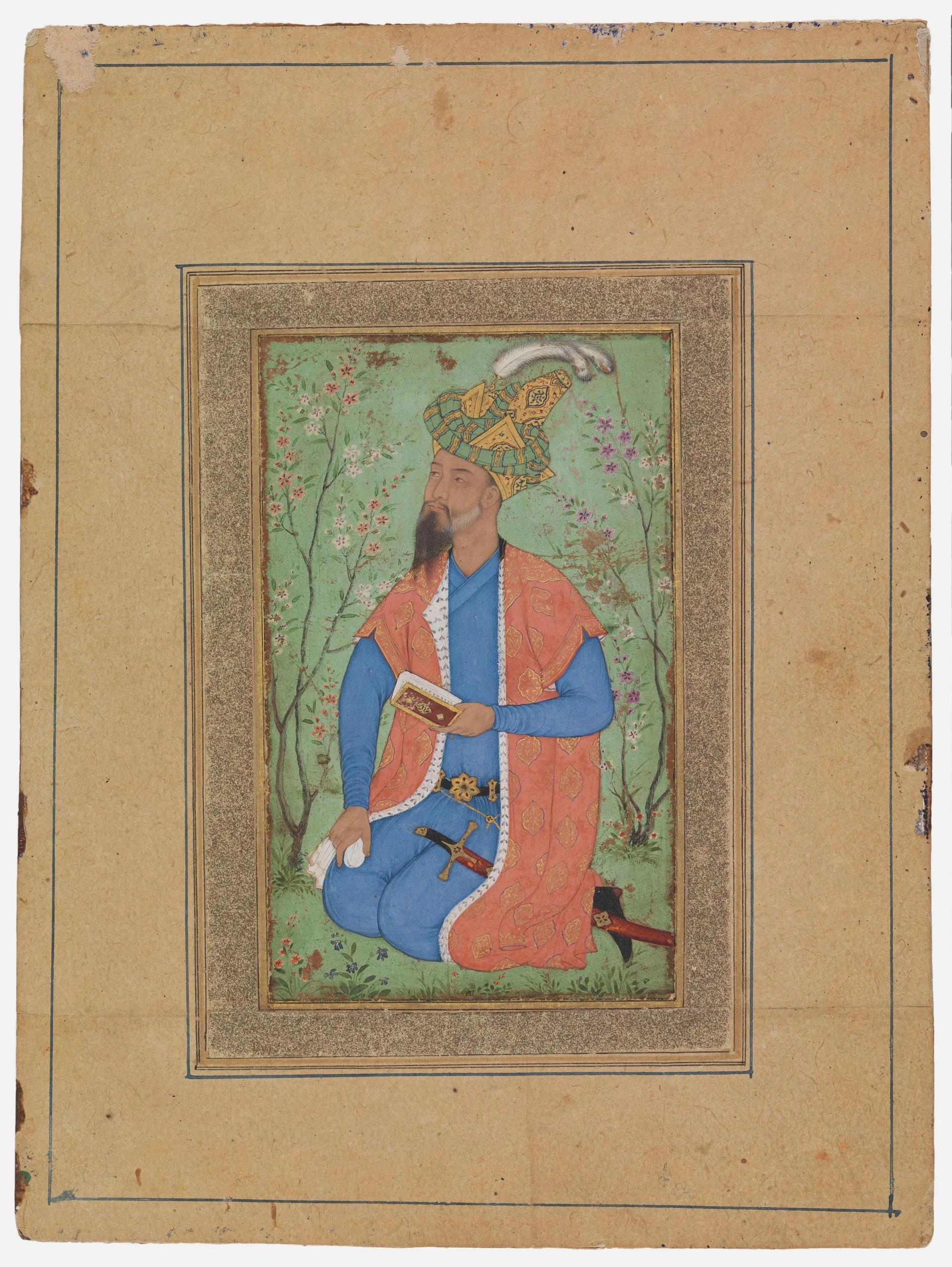 In this individualized, sensitive portrait, Hindal Mirza wears the distinctive Chaghatai-style headgear, known as a Crown of Power and Glory (Taj-i ‘Izzat), which was favored by Humayun and his brothers. Hindal wears a blue garment and an elegant red and gold overcoat with a white fur (?) border. He holds a small book with a lacquered and gilded cover, symbolic of wisdom, and a handkerchief, an emblem of cultural refinement. Around his waist he wears a sword belt with bejeweled golden fittings and a Persian shamshir (lion’s tail) sabre, indicative of his prowess as a warrior. Hindal sits in a garden with delicate flowering plants and a light green background characteristic of Akbar-period painting.