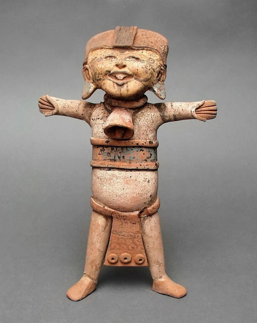 Terracotta ceramic figurine of a standing human form with outstretched arms, open grin, headdress, and banded torso armor, with traces of cream slip and blue-green pigment