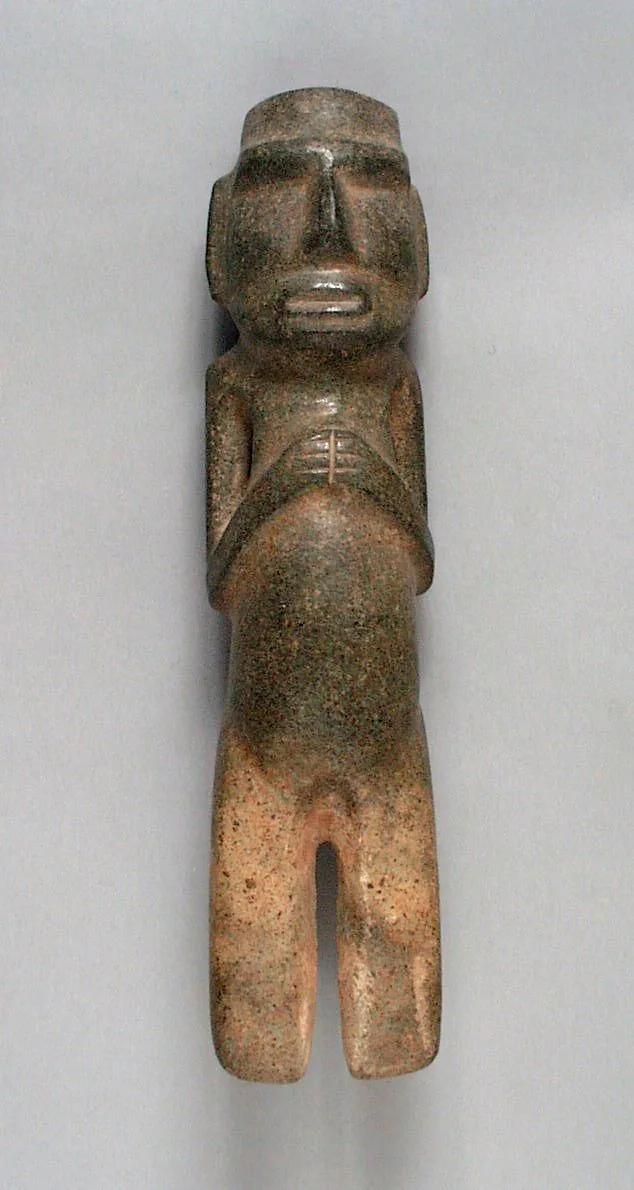 Small carved stone figurine of a standing human form, olive green and russet-orange, with a blocky head, incised facial features, and simplified legs