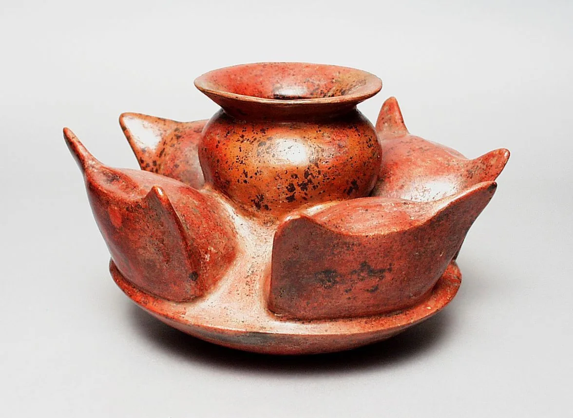 Burnished ceramic vessel with a wide flat base, rounded central jar with flared mouth, and four upright petal-like projections, covered in brick-red and dark brown fire-clouded slip
