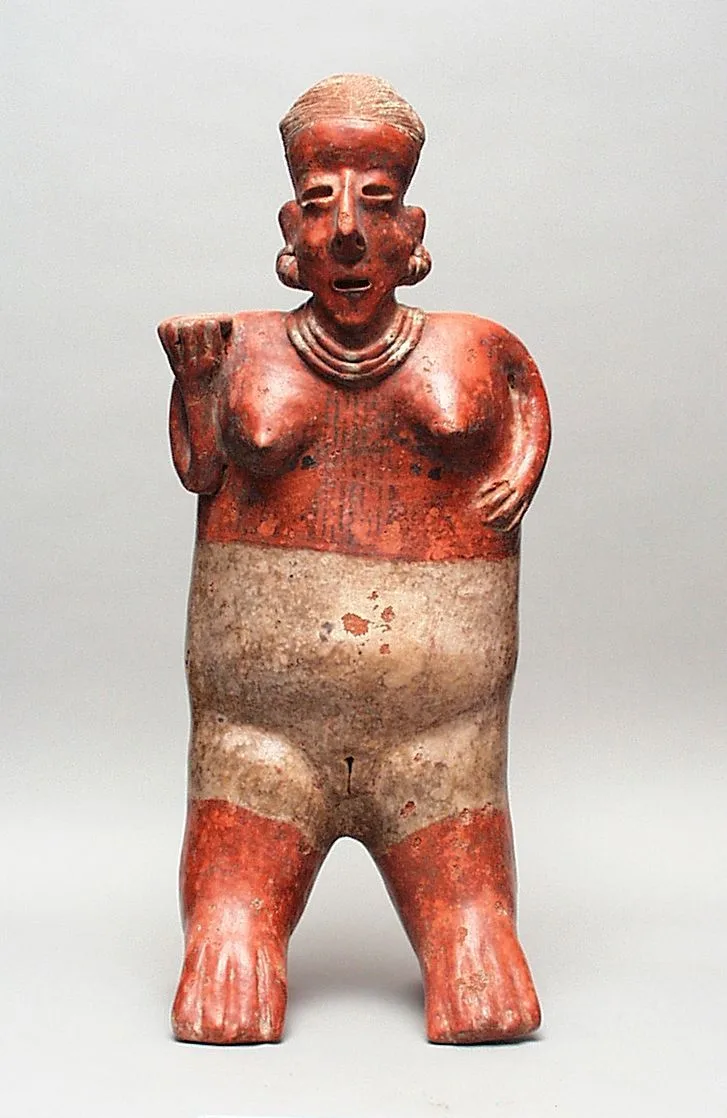 Ceramic standing female figure with brick-red slip on upper body and lower legs, unpainted beige midsection, and modeled facial features including parted lips and disc-shaped ears