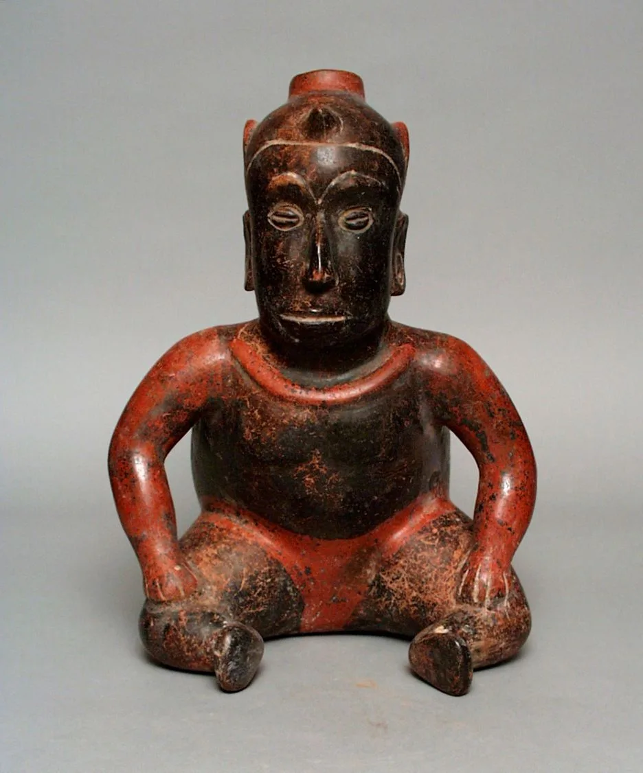 Ceramic figural vessel of a seated human figure, painted in dark brown and brick red with burnished surface and cylindrical spout at the crown of the head