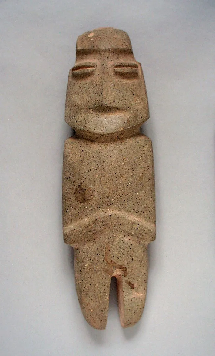 Small stone sculpture of a stylized standing human figure, sandy beige with coarse texture, simply carved with slit eyes and stubby legs