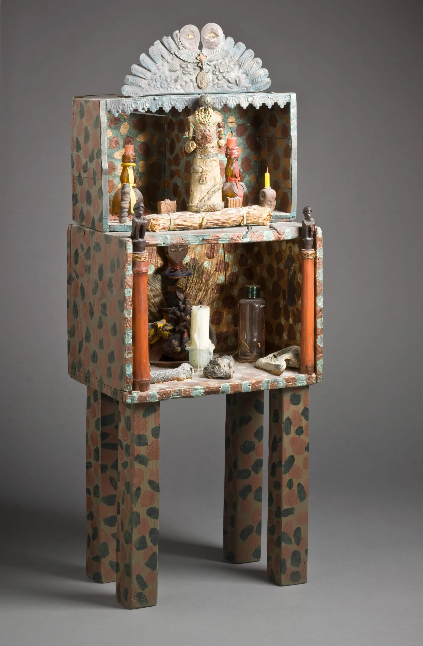 - Wood, wire, glass, candles, braided rope, stones, nails, oil paint, feathers, beads, steel, bronze, corn husks, and petrified wood
