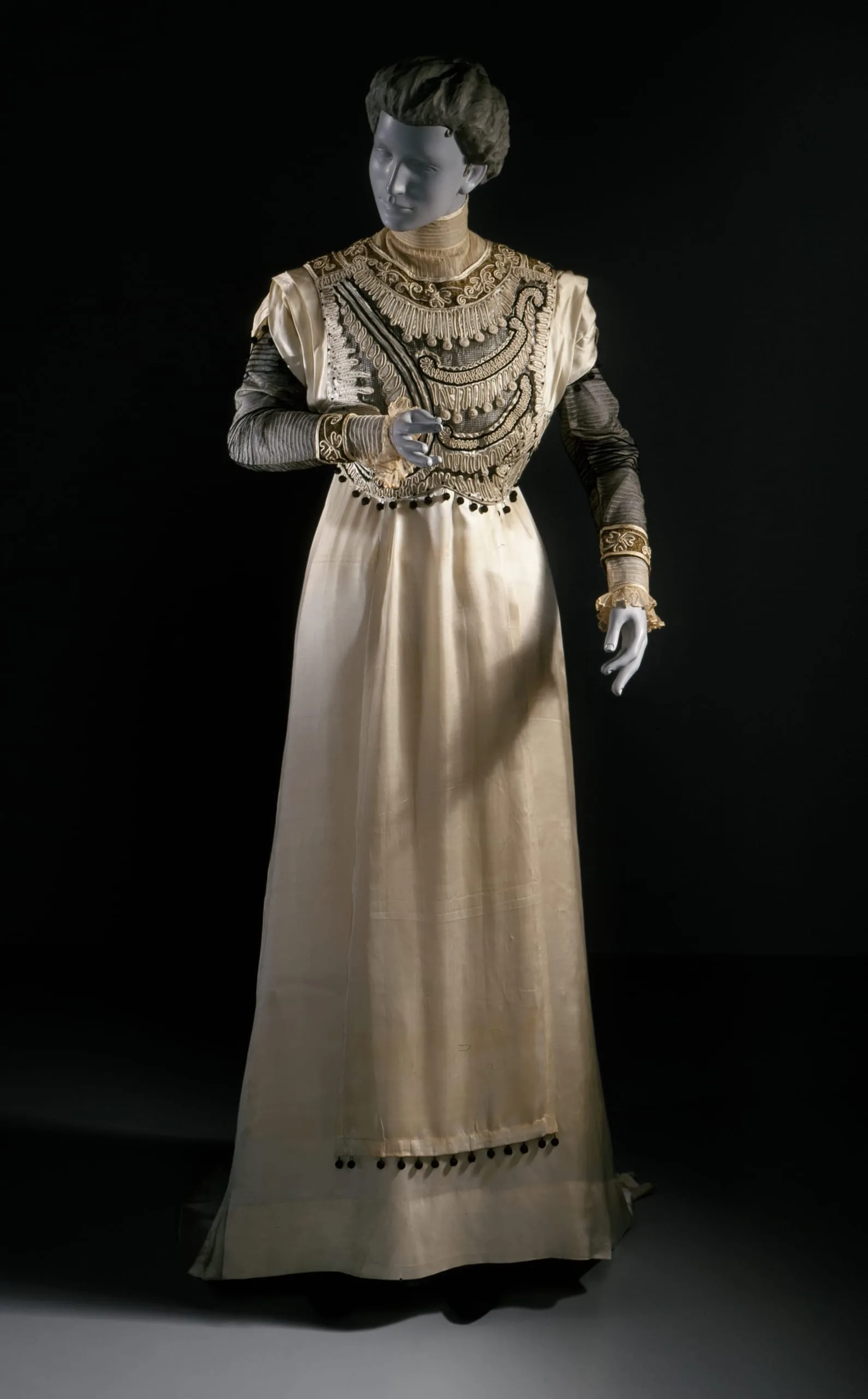 - Silk plain weave with silk net, silk and metallic-thread embroidery, silk passementerie, and silk ball fringe