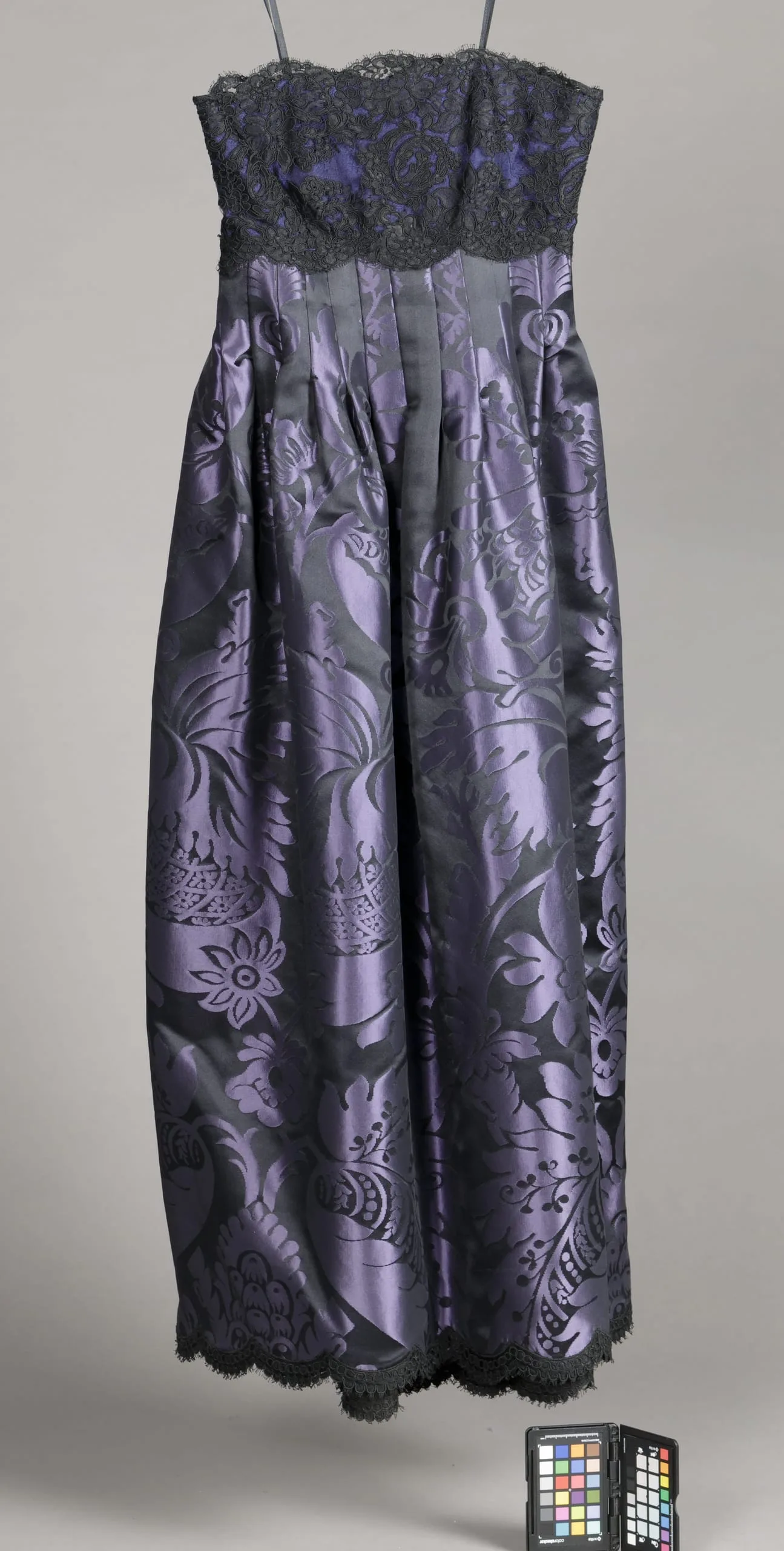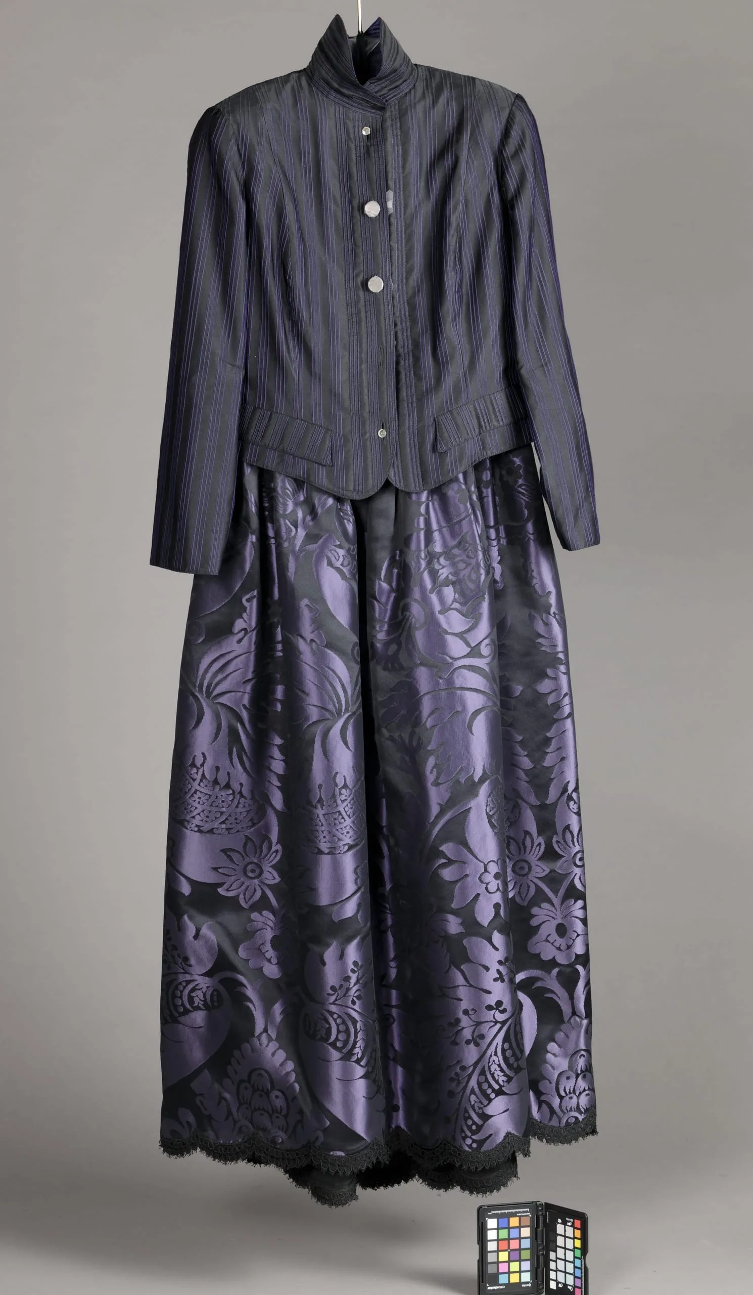 - Dress: Silk damask, silk machine-made lace, silk net; Jacket: Silk twill with supplementary warp patterning, mother-of-pearl buttons