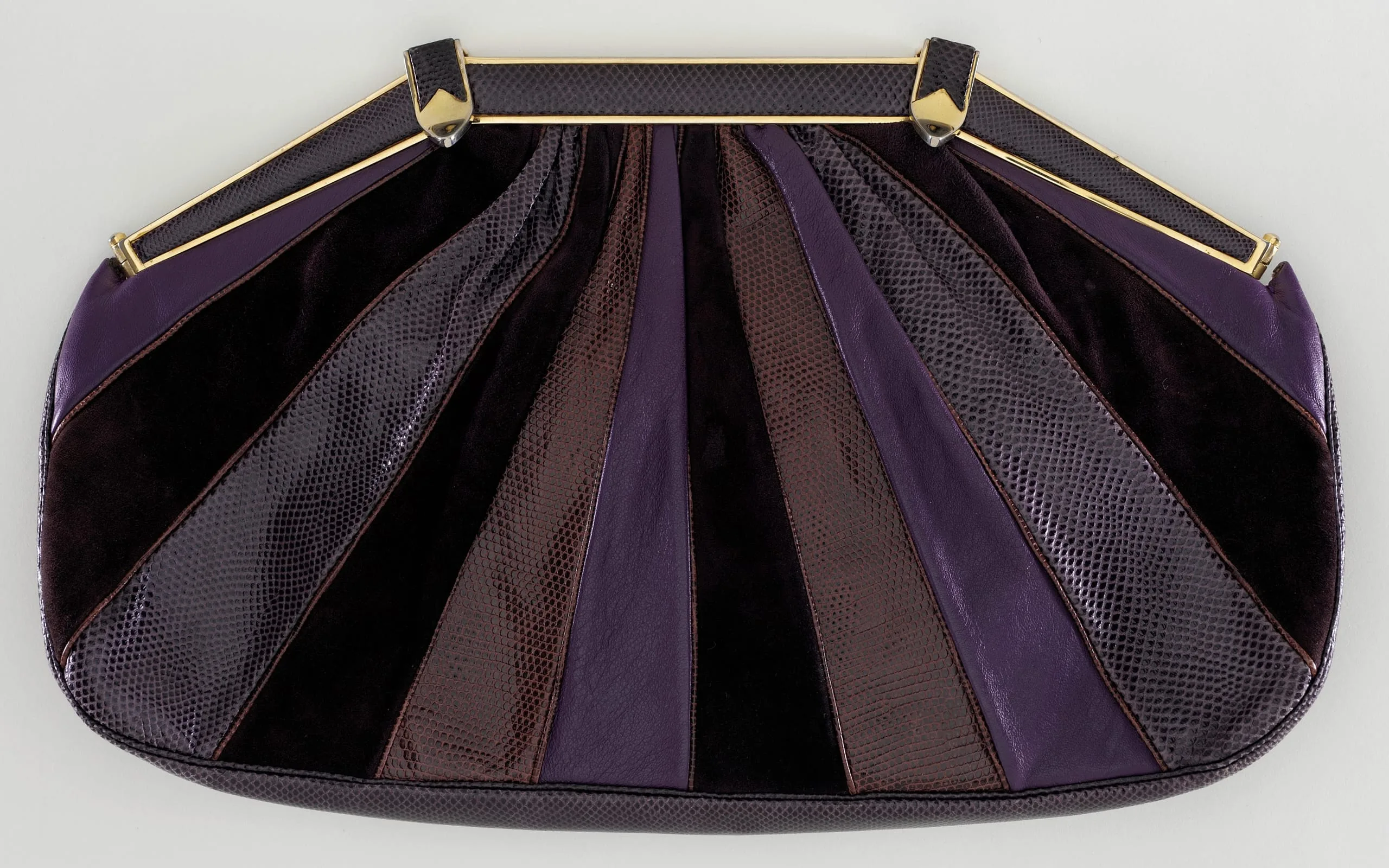 - Leather, suede, snakeskin, silk satin, gold tone metal