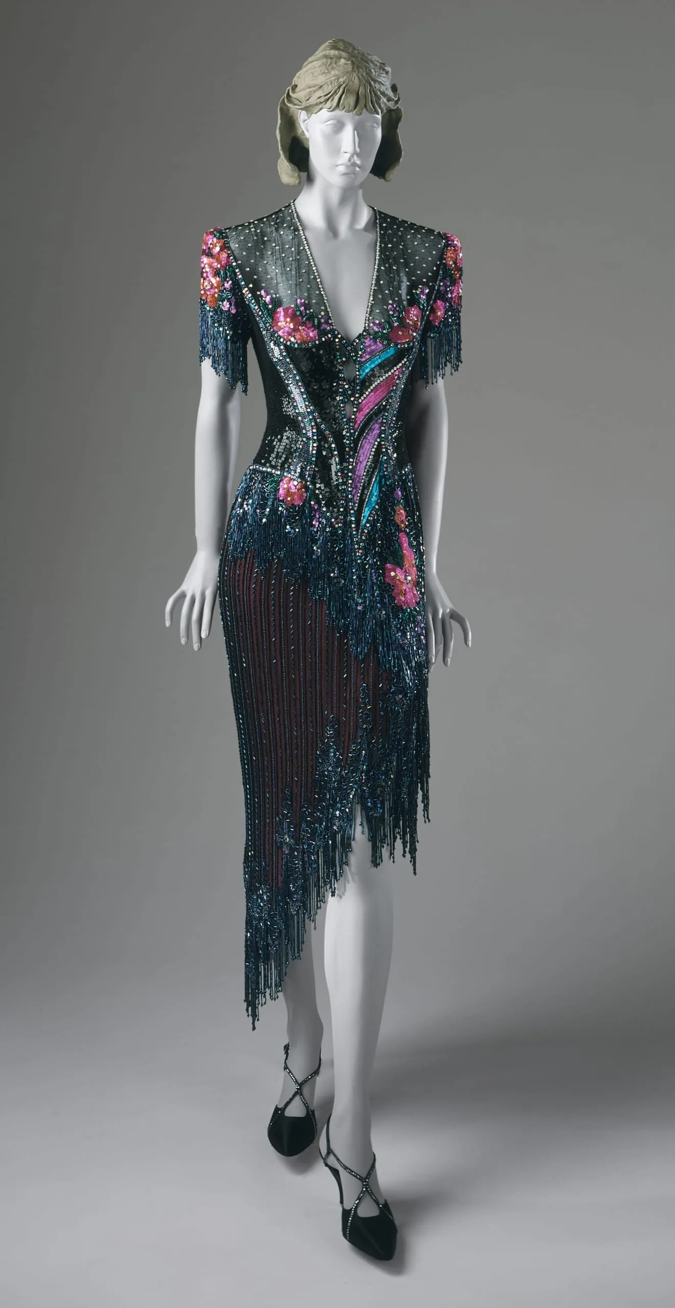 - Glass beads, plastic sequins on silk plain weave (chiffon), silk plain weave, silk net