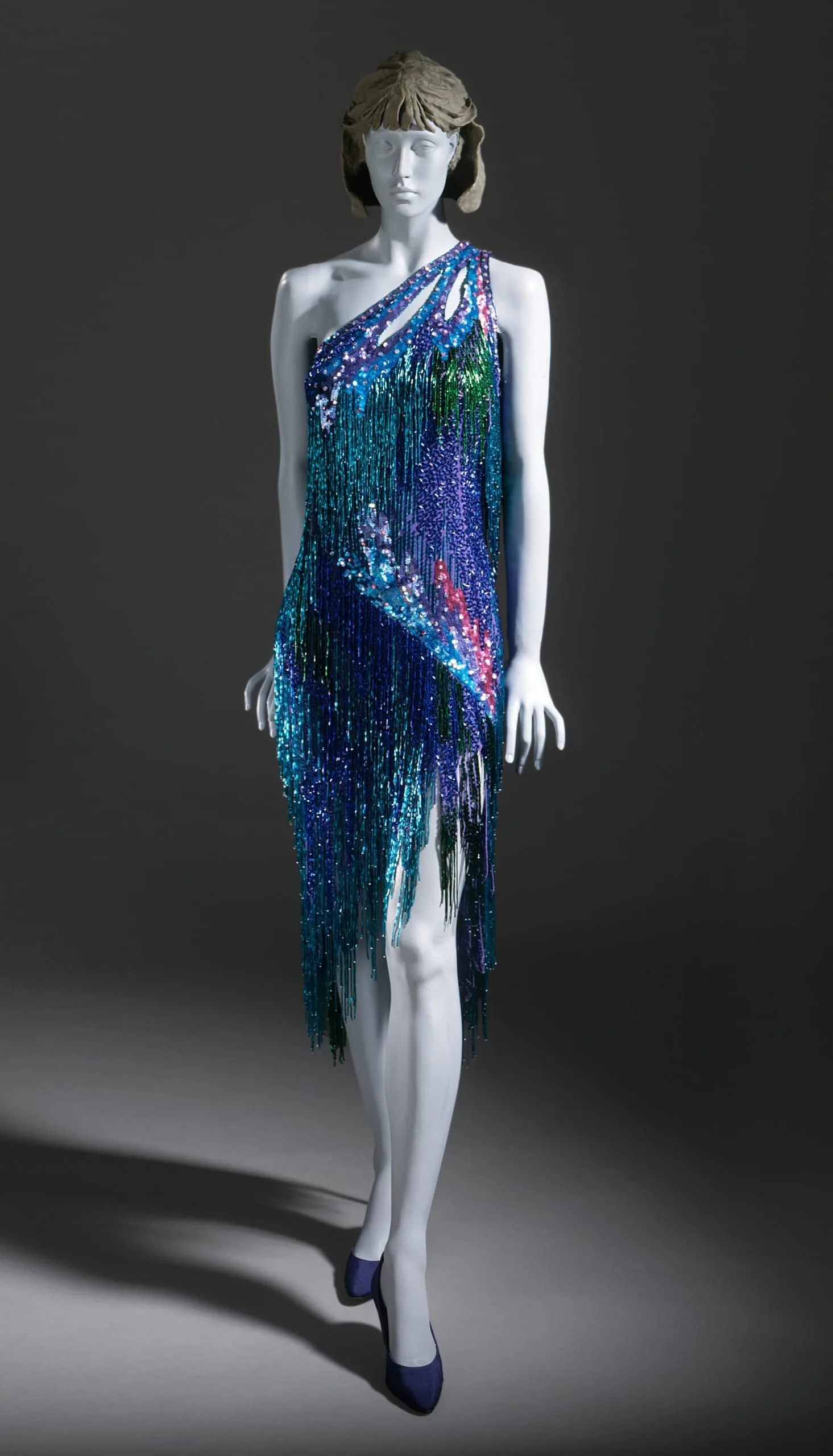 - Glass beads, plastic sequins on silk plain weave (chiffon) ground