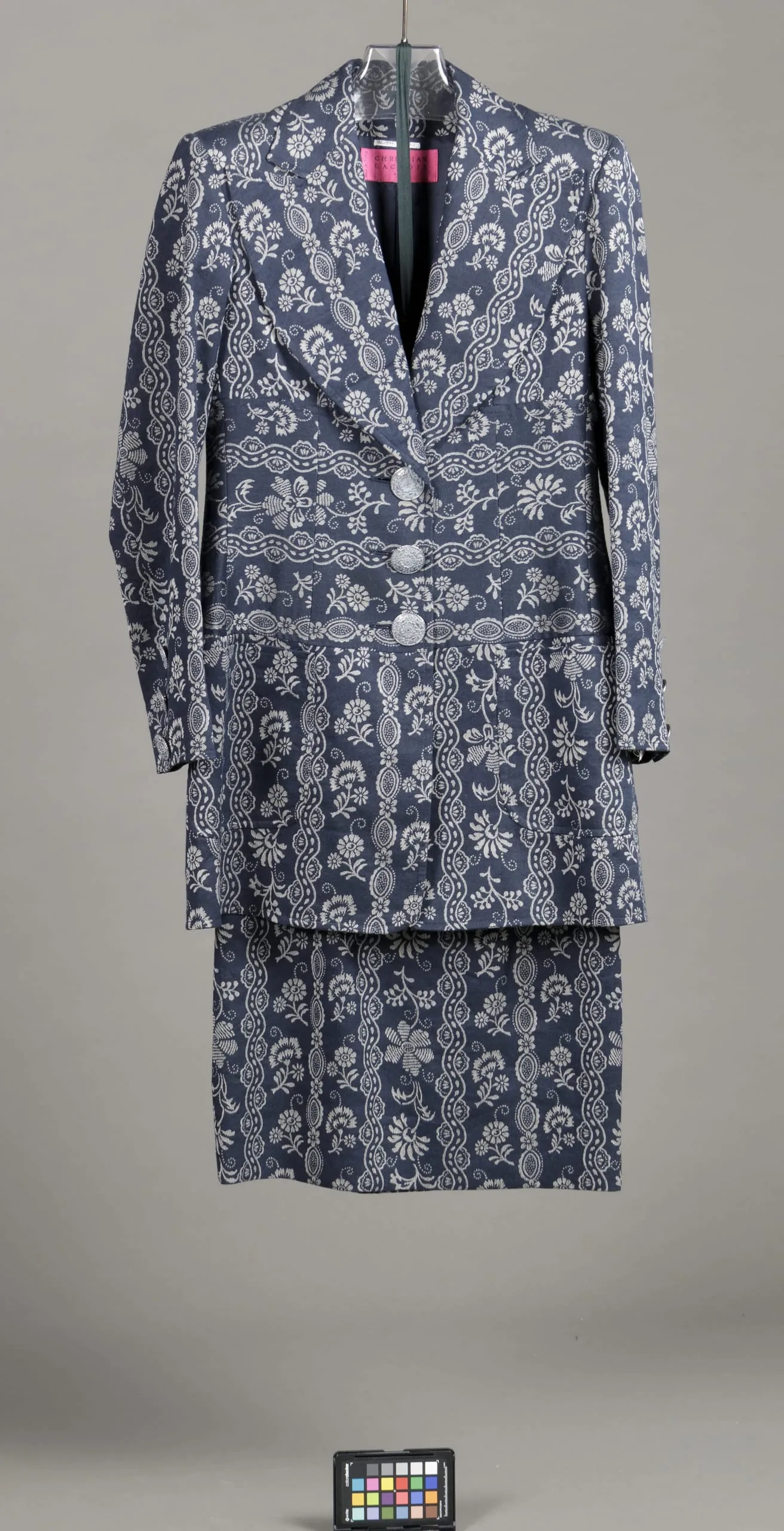- Cotto/linen twill with supplementary warp patterning, metal buttons