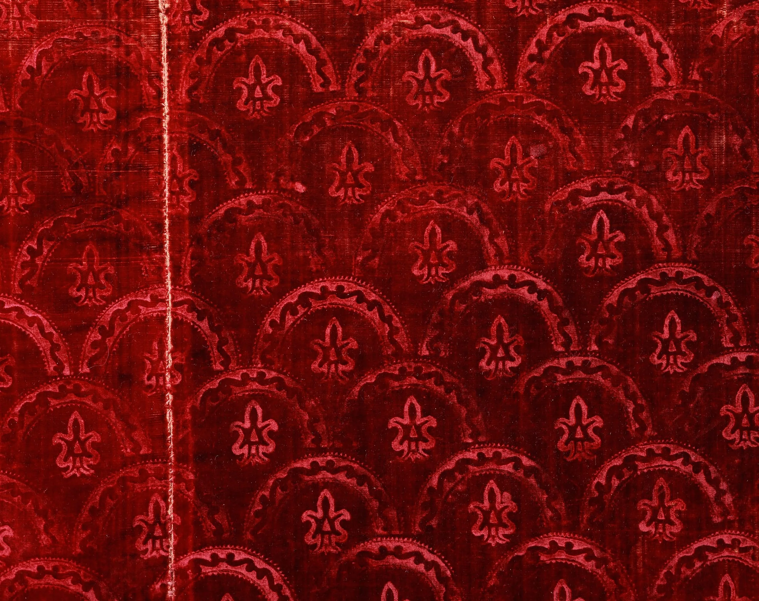 - Silk velvet, stamped, and linen plain weave (canvas) with silk and metallic thread embroidery and metallic thread passementerie
