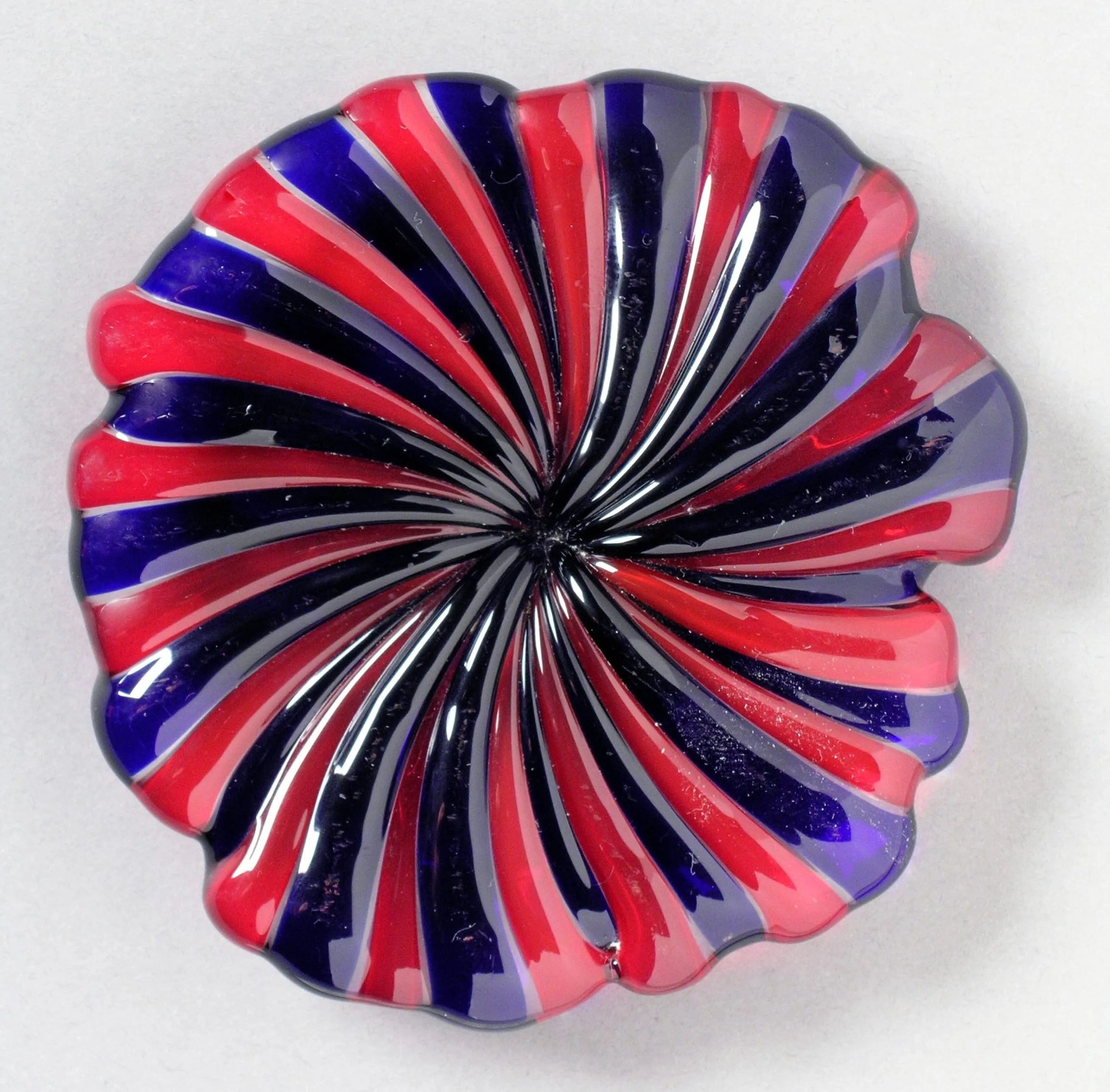 Glass bowl viewed from above with a scalloped rim and spiraling ribbed stripes in crimson red, coral pink, cobalt blue, and periwinkle lavender radiating from a central point