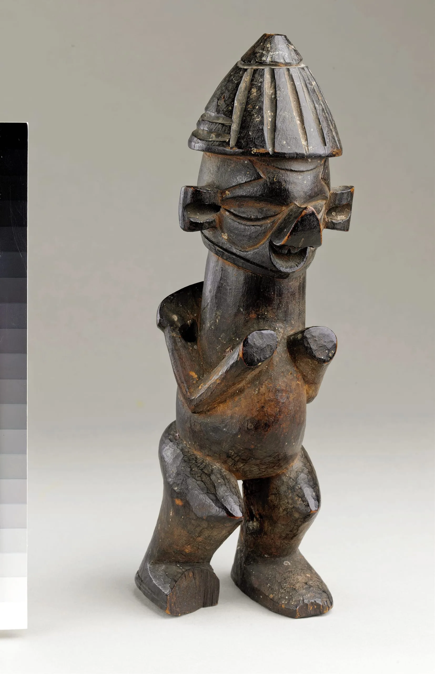 Carved wood standing figure with dark brown-black patina, conical ridged headdress, bent arms raised to chest, and wide block-like feet
