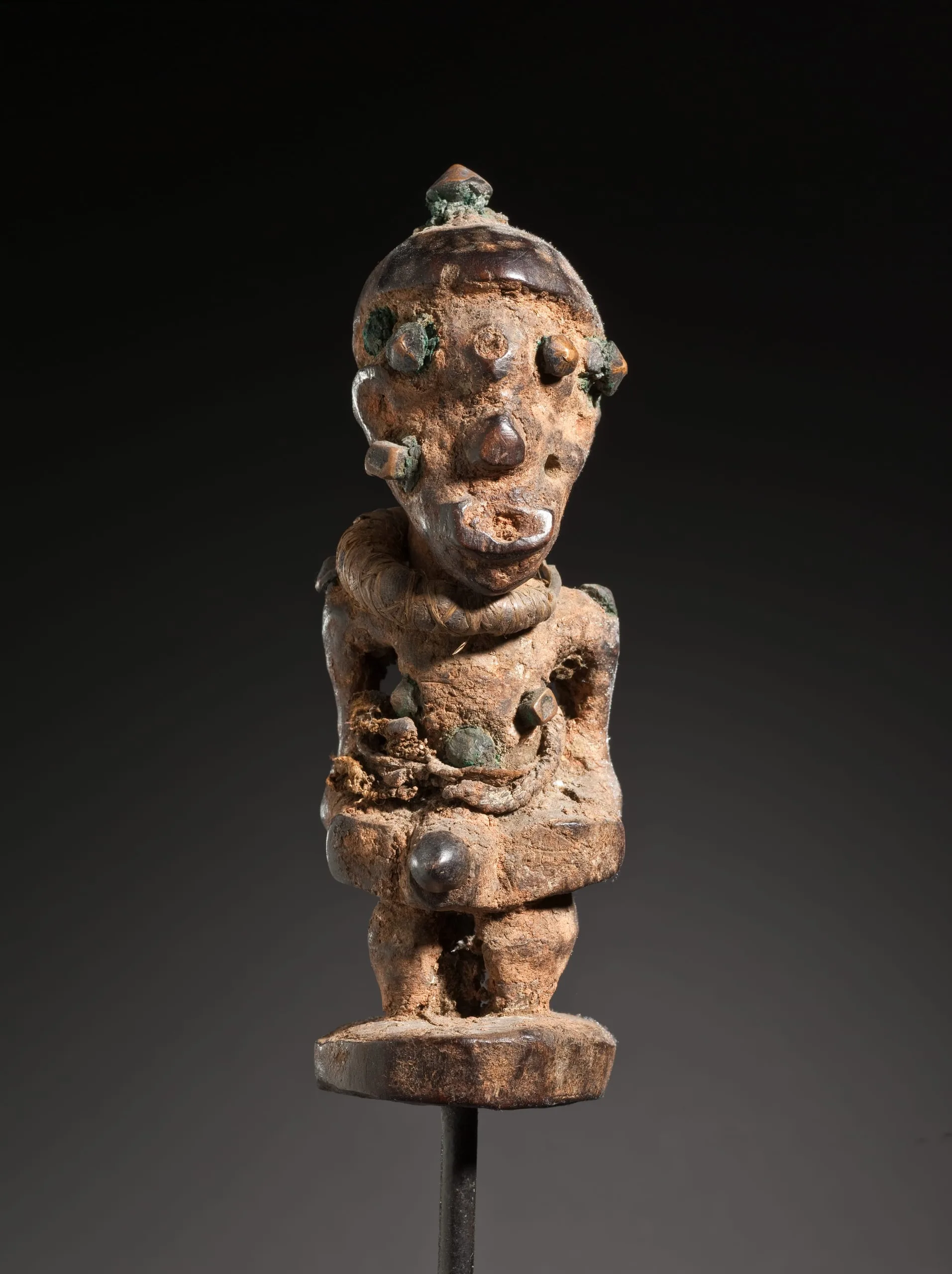 Small standing wood and mixed-media figure with heavily encrusted surface, embedded metallic elements showing green patina, mounted on a thin metal display rod
