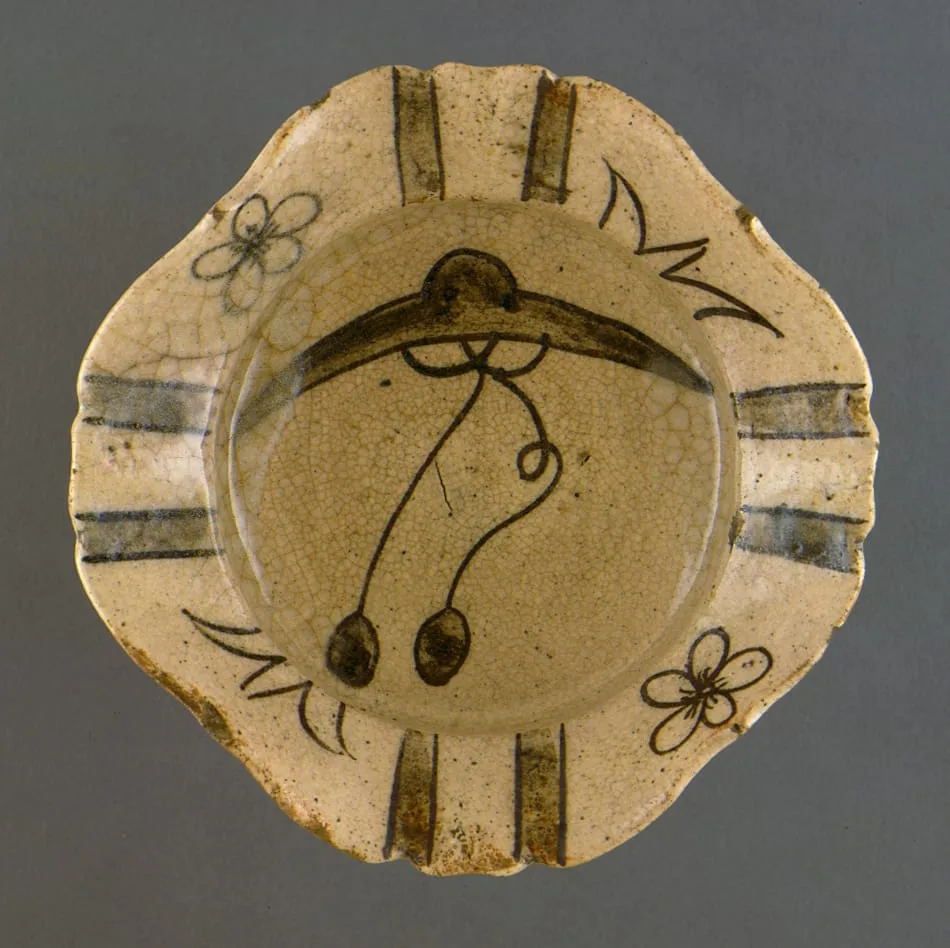 - Stoneware; iron underglazing painting, Shino white glaze