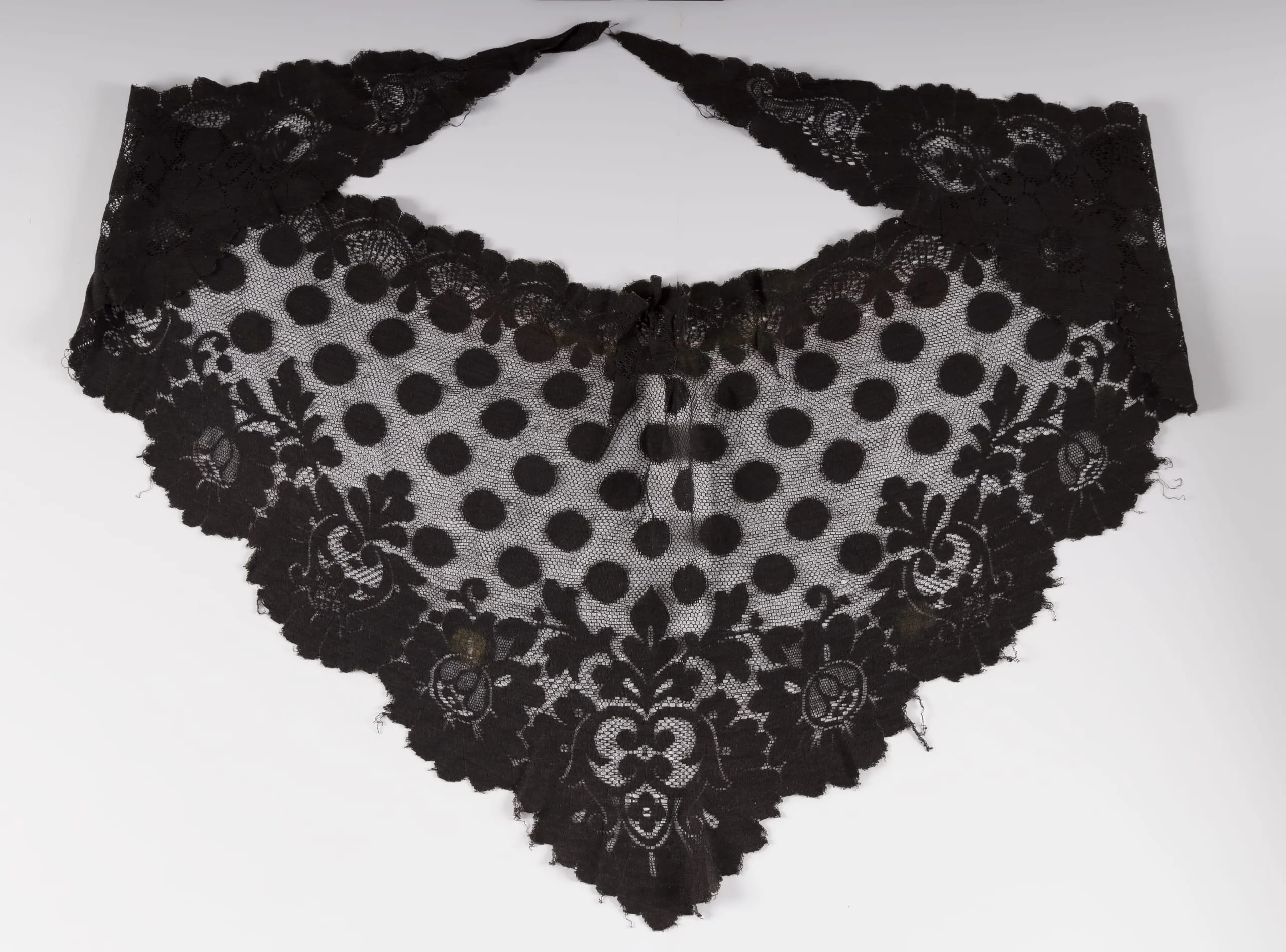 Black lace collar or fichu in a triangular shape, with a sheer dotted net center field and wide floral lace border with scalloped edges, laid flat