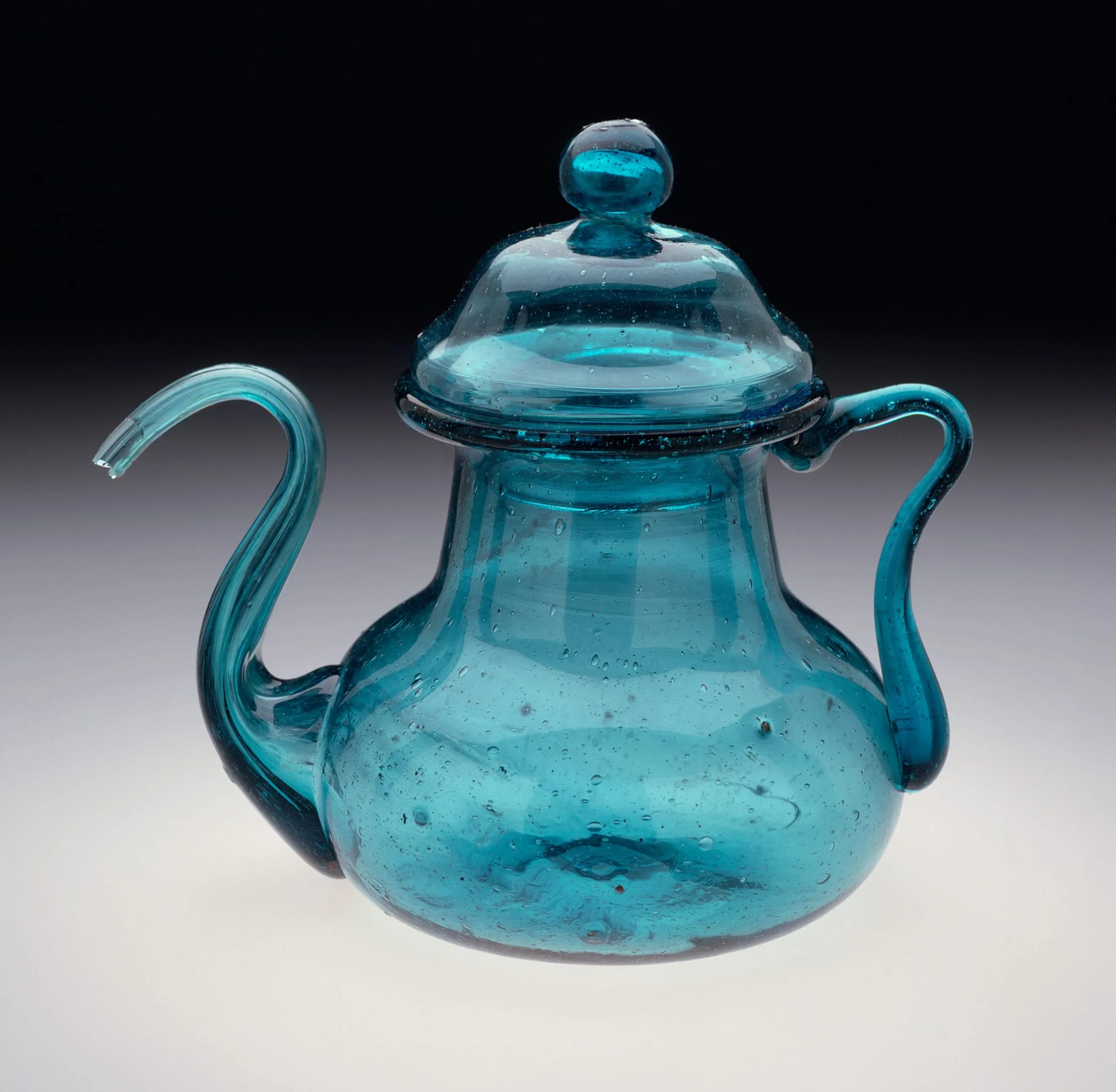 This lidded teapot made of peacock blue glass has a compressed bulbous body with a thick neck and an everted flat rim. It has a graceful S-shaped spout and an ear-shaped solid handle. The lid is a bell-shaped dome with a knob terminal. Tea and Chinese-style tablewares for steeping and drinking it were introduced into England and its colonial spheres of influence in the 17th century.
