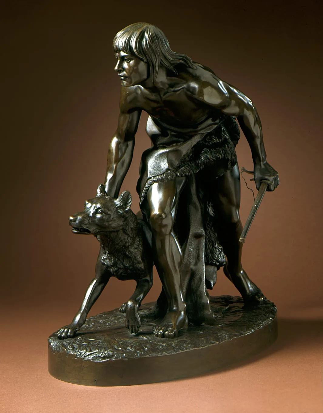 This bronze demonstrates Ward’s skill at infusing a figure with an animated realism that was new to American sculpture. The surface of the man’s body is highly polished, and extensive chasing developed texture in other areas. Ward contrasts the textures of the man’s smooth skin, the coarse, thick hair of the pelt, and the soft, curly fur of the dog. Moreover, the poses are those of suspended animation as the hunter stalks his prey, momentarily holding back his dog to concentrate on the quarry.