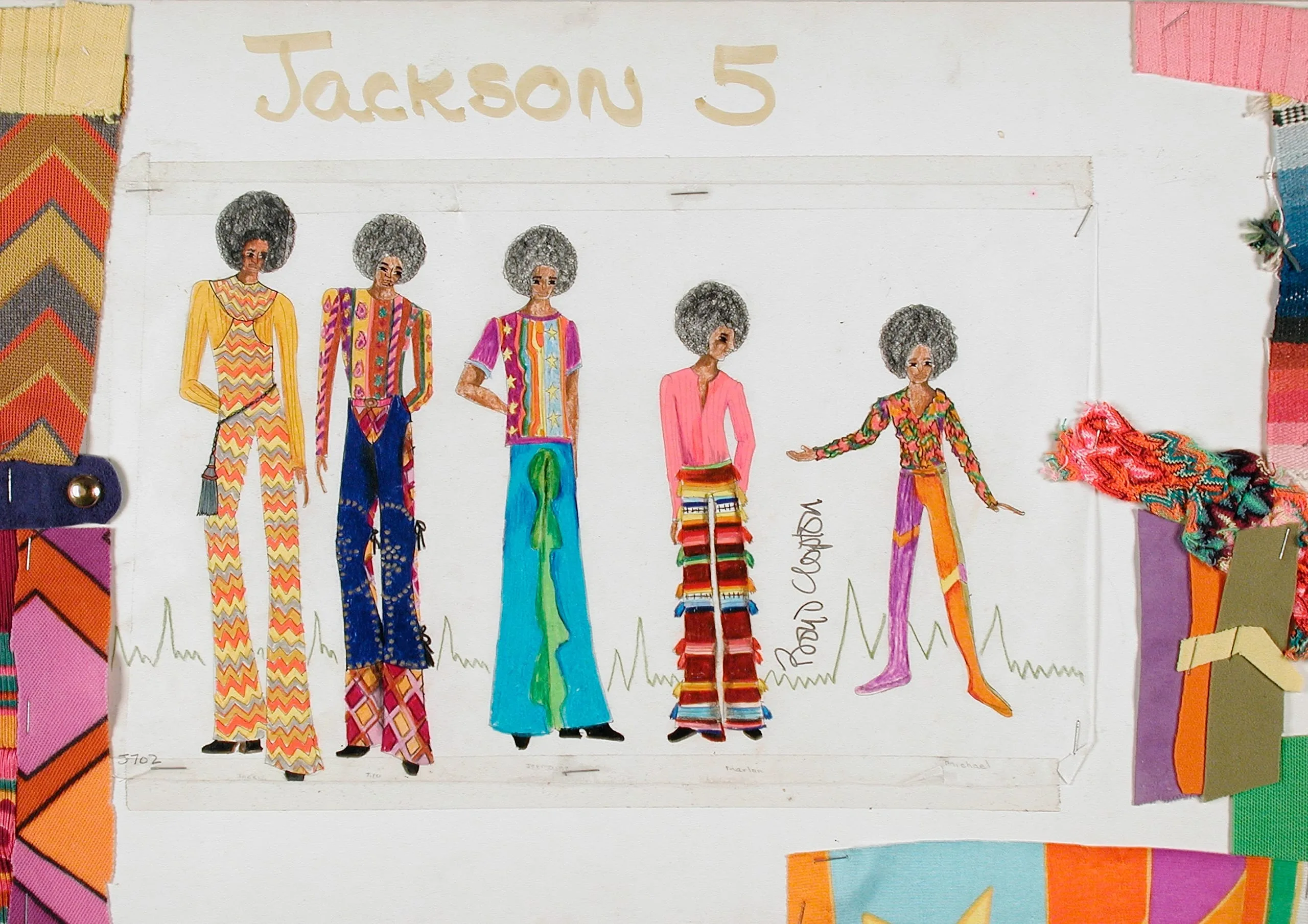 Costume design drawing in ink and gouache showing five stylized figures in colorful 1970s-style outfits with afros, surrounded by fabric swatches, titled 'Jackson 5'