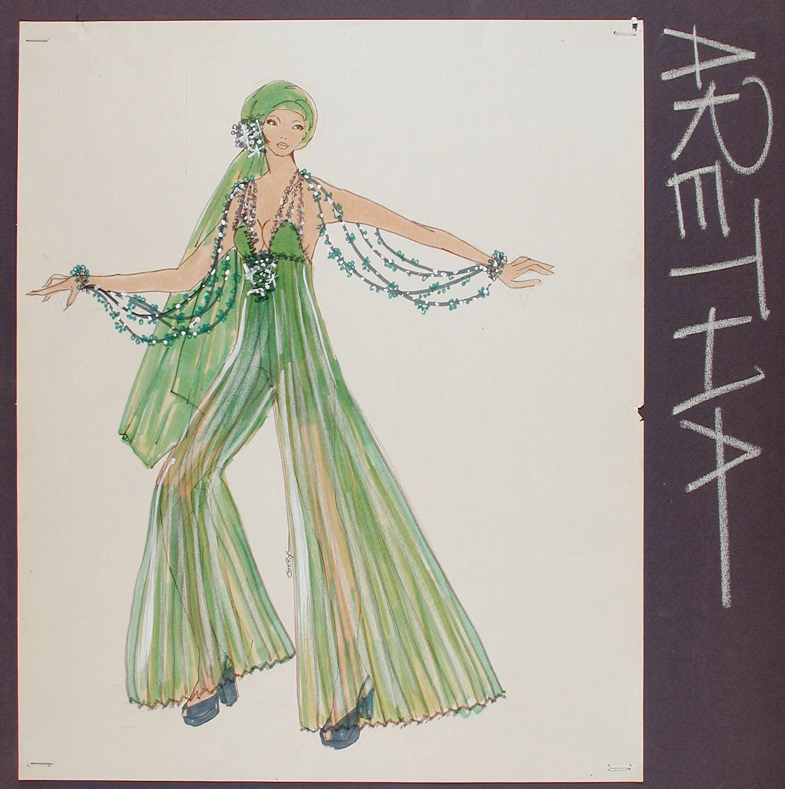 Fashion illustration in ink and watercolor of a woman in a floor-length green pleated ensemble with draped bead garlands, arms extended, mounted beside vertical chalk lettering reading 'ARETHA'
