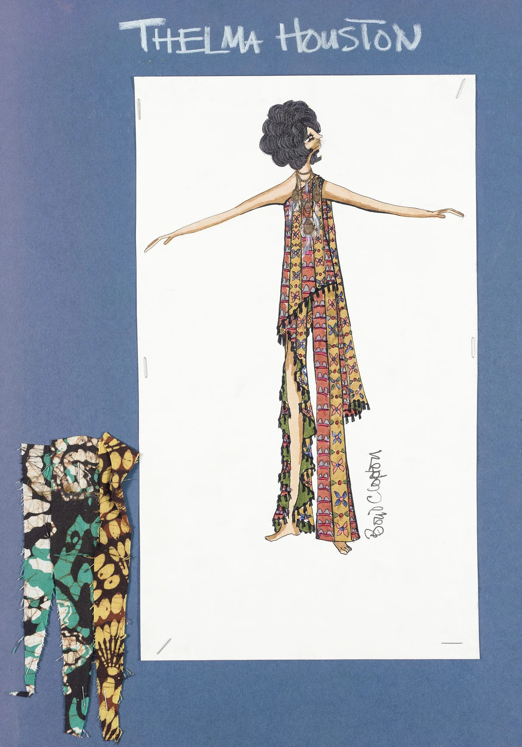 Costume design sketch in ink and watercolor on white paper, mounted on slate-blue board, showing a full-length figure in patterned wide-leg trousers and fringed vest, arms outstretched, with fabric swatches attached lower left