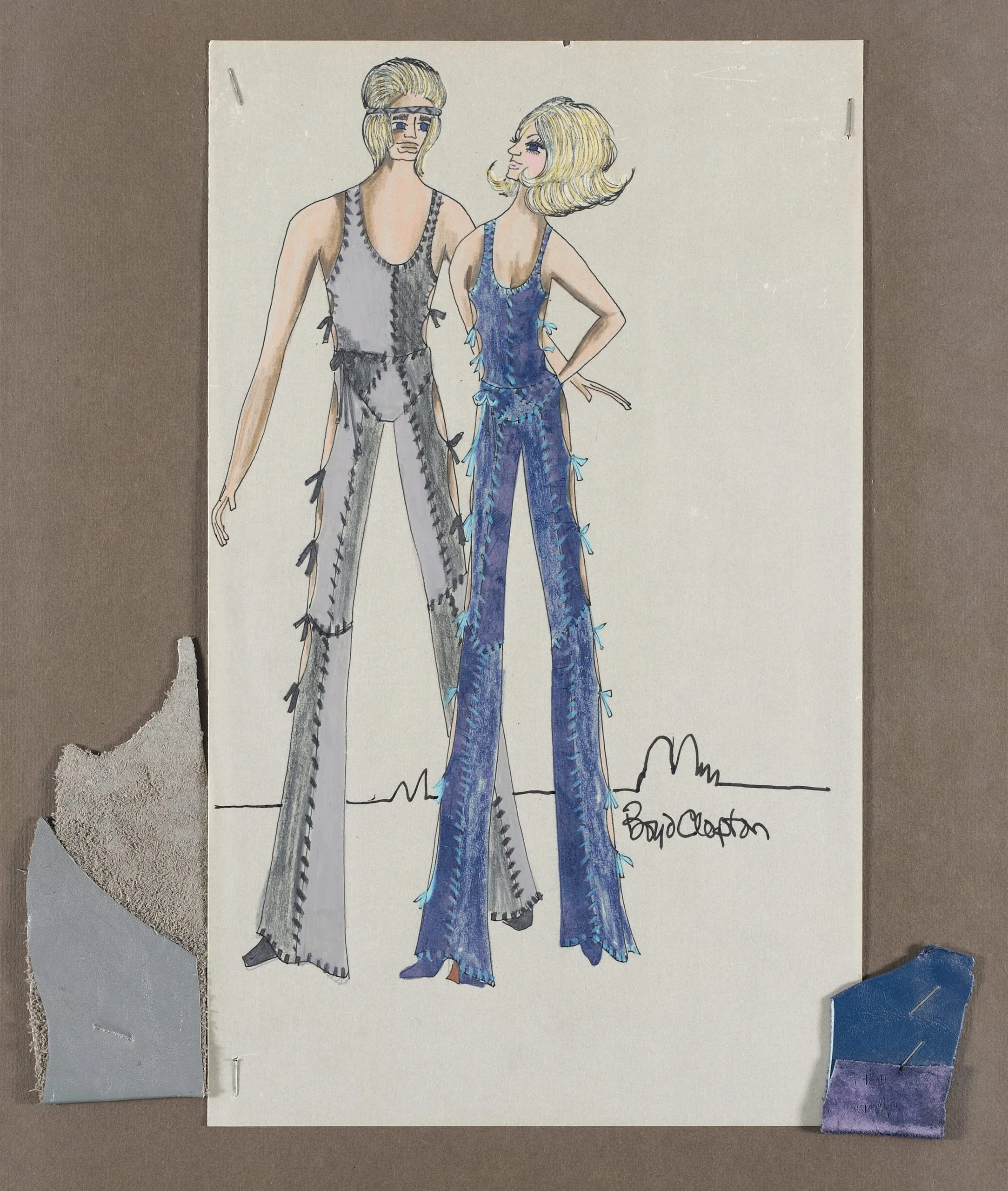 Fashion illustration in ink and watercolor on cream paper, two full-length figures shown from behind wearing flared jumpsuits, one gray with bow trim, one blue with fringe, fabric swatches pinned nearby