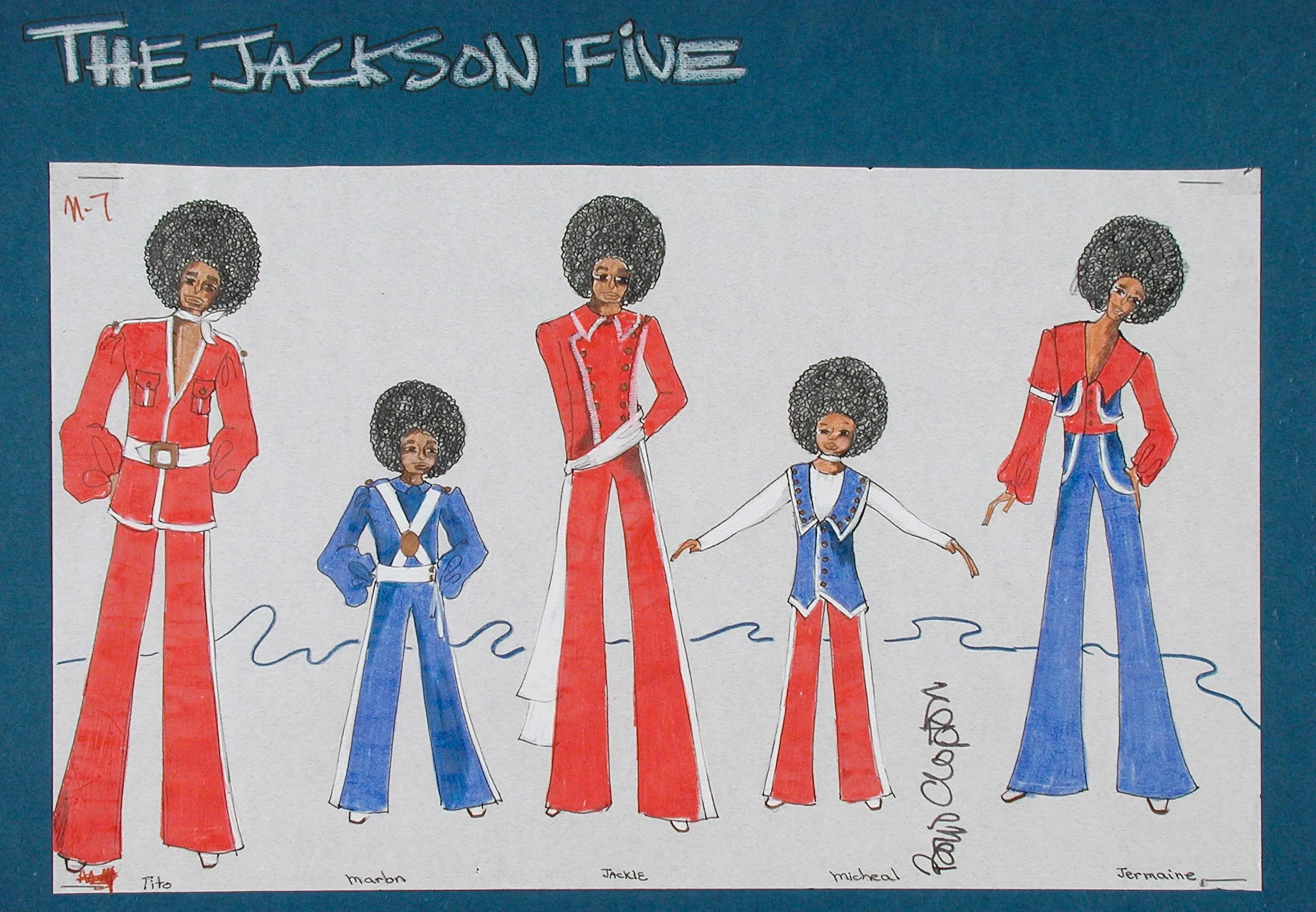 Ink and watercolor costume design drawing of five figures in red and blue 1970s-style outfits, labeled as members of the Jackson Five, with hand-lettered title above