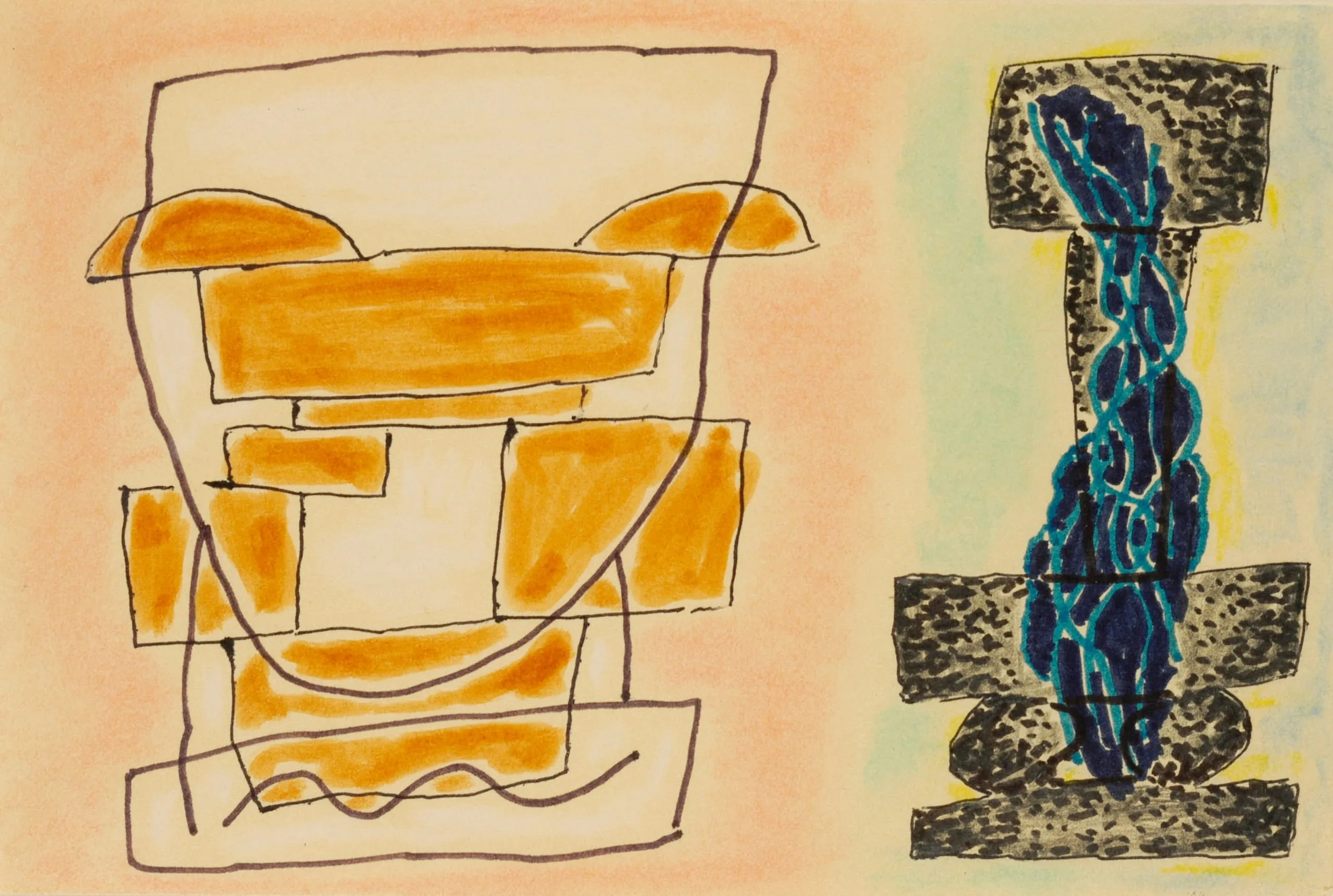 Abstract drawing with two compositions: left shows stacked orange wash shapes with dark ink outlines on salmon ground; right shows a cross-like gray stippled form with a twisting navy and teal figure at center