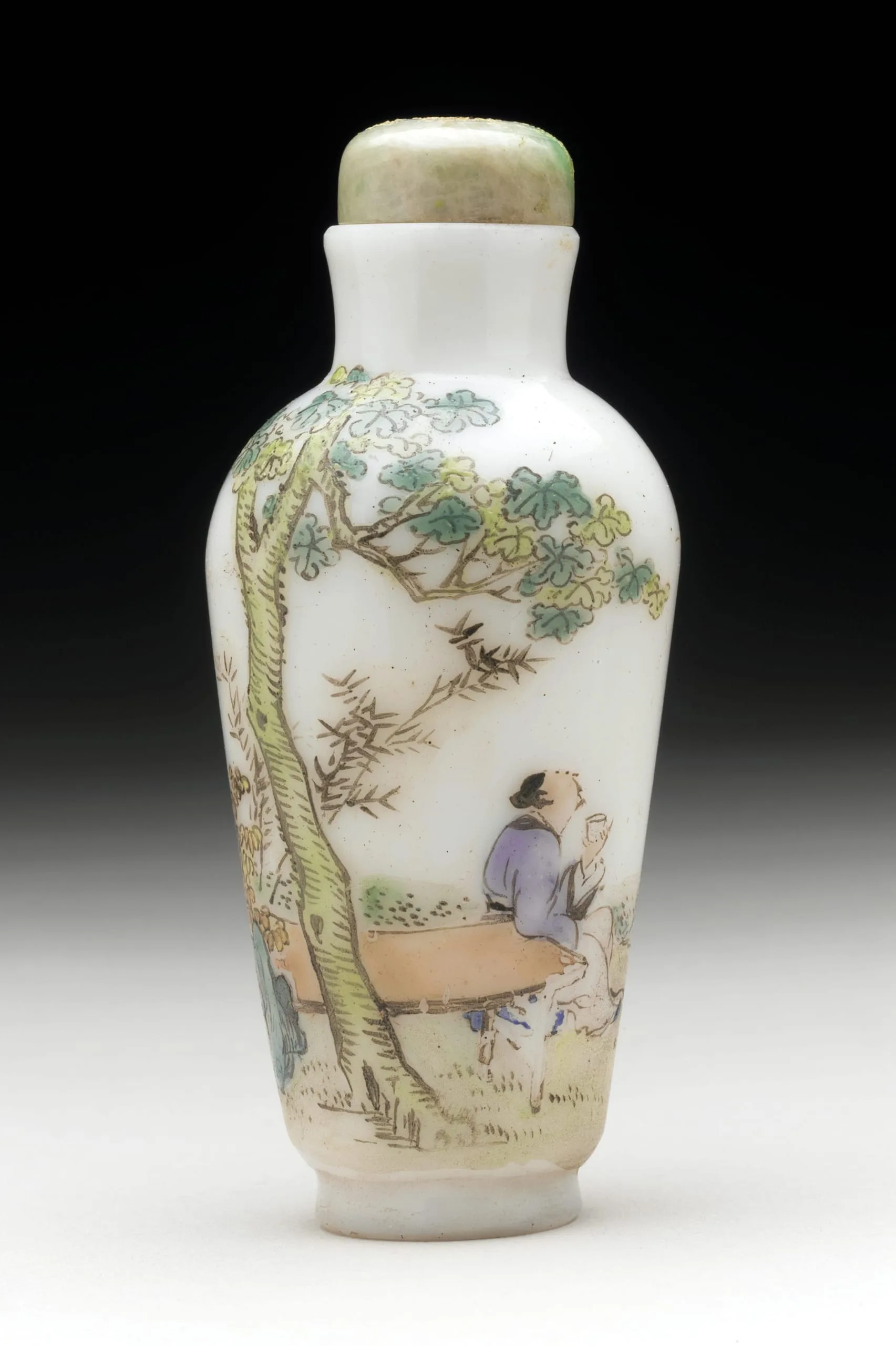- Opaque white glass with painted enamel decoration, with jade stopper