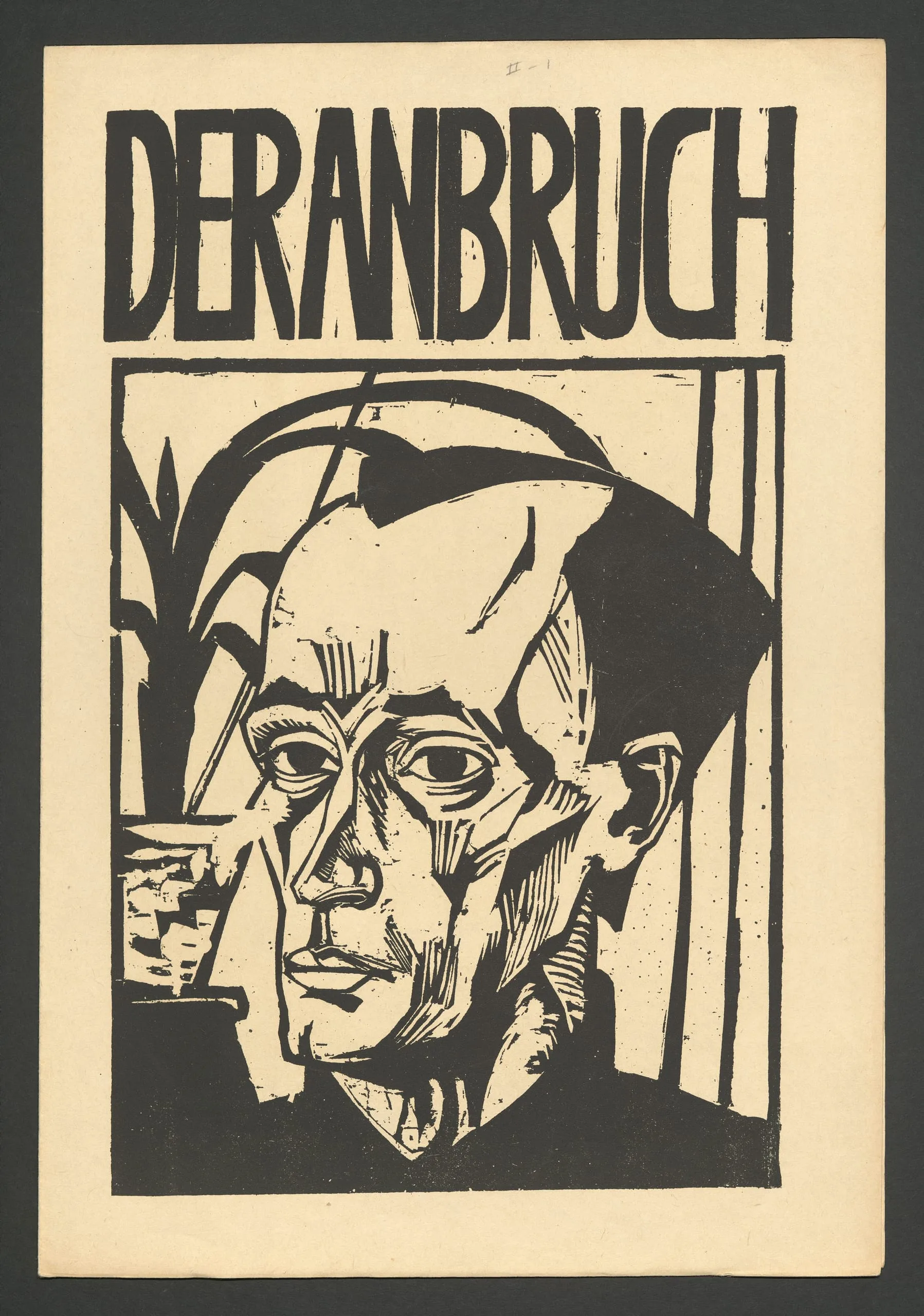 Woodcut print with bold black-on-cream lettering reading 'DER ANBRUCH' above a close-cropped portrait of a man's angular face rendered in high-contrast black and cream with coarse carved lines