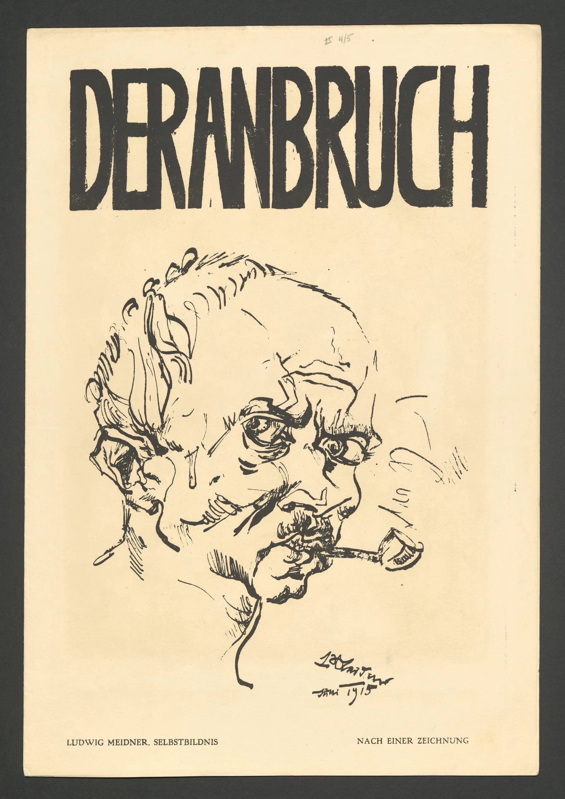 Print on cream paper, expressive ink portrait of a man smoking a pipe beneath bold block lettering reading 'DER ANBRUCH'