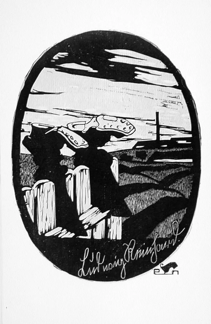 - Woodcut printed in blue and green on PH Antique paper