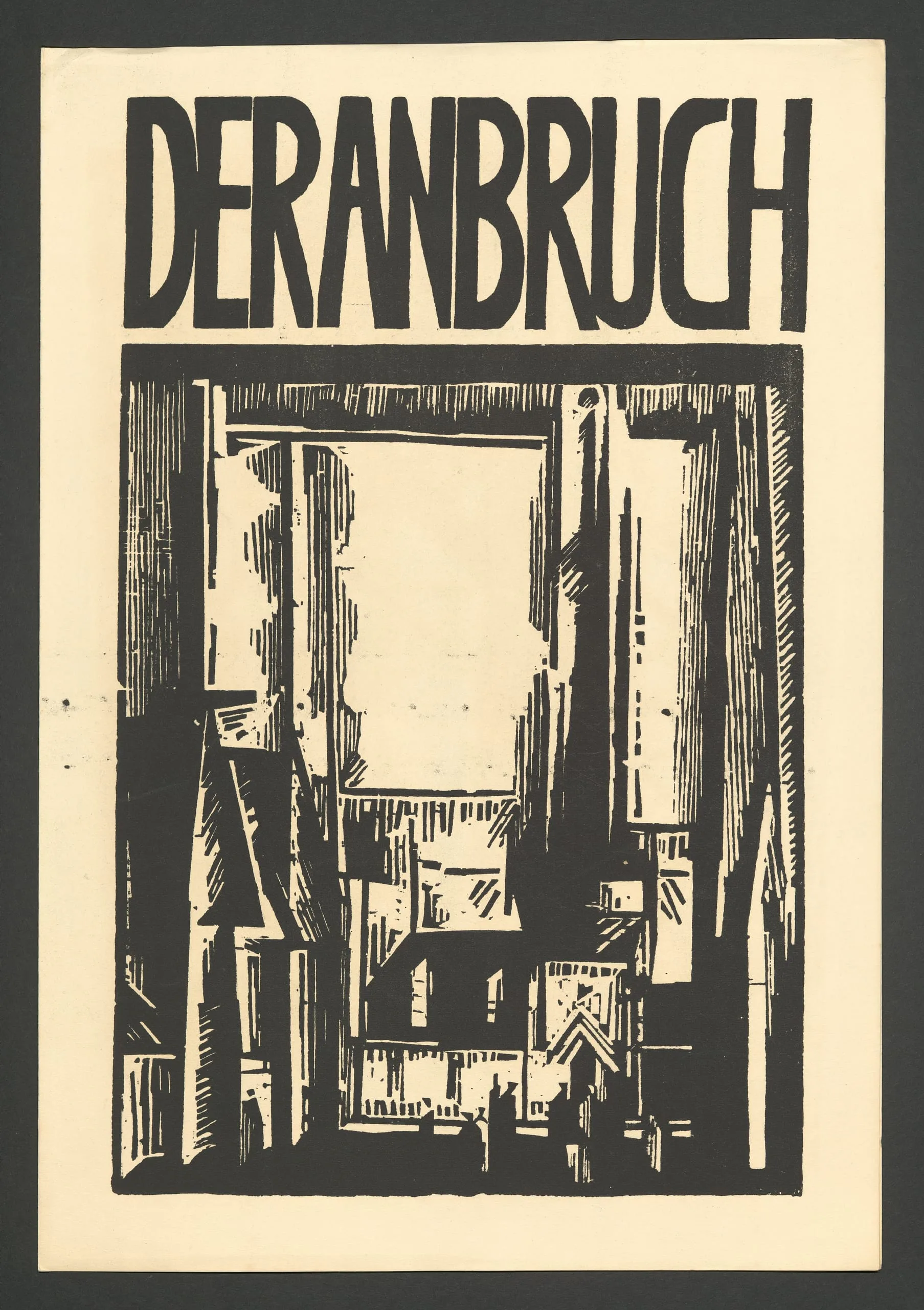 Woodcut print with bold black lettering reading 'DER ANBRUCH' above a framed cityscape of angular buildings and narrow street viewed from below, with two tiny figures at center