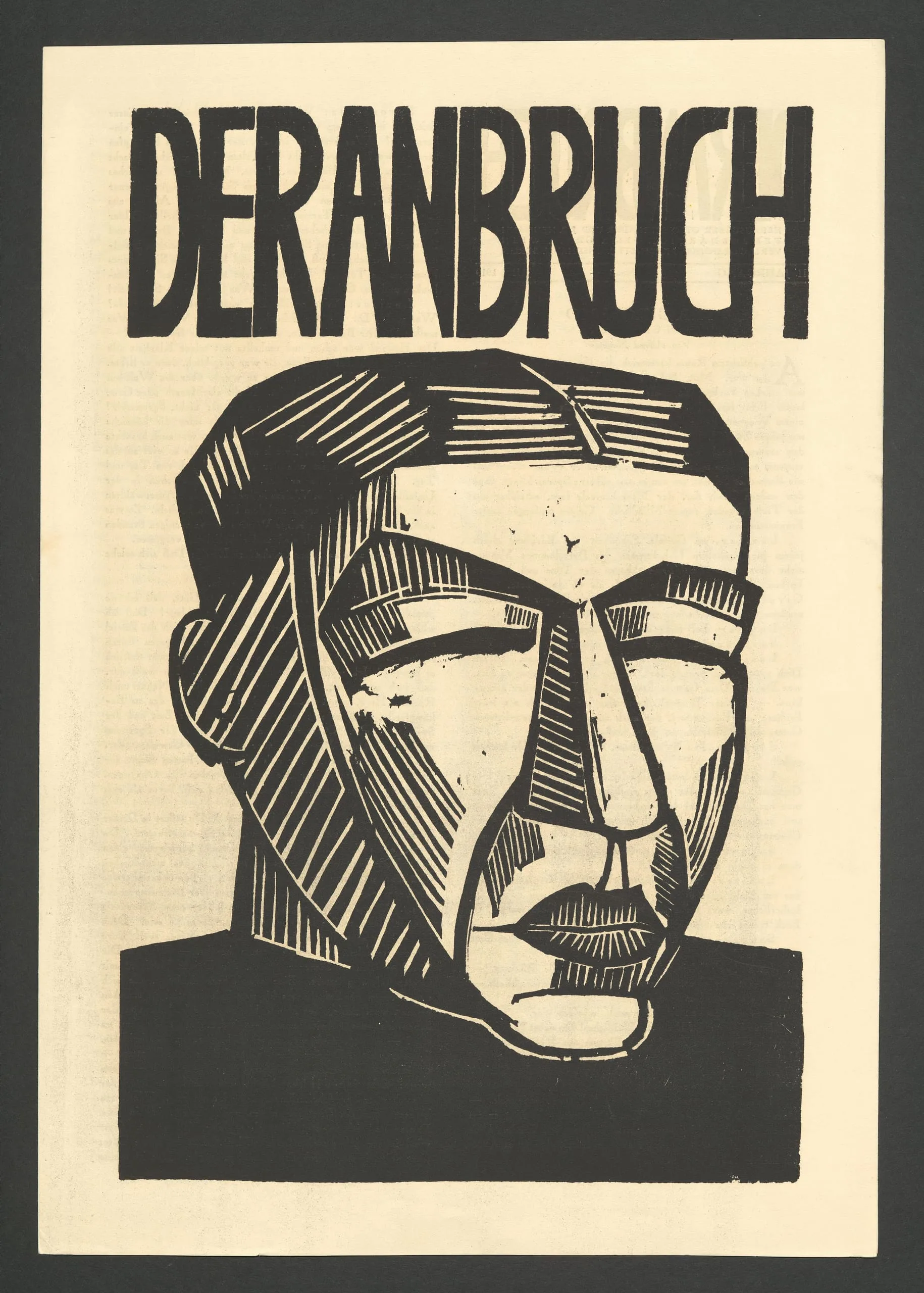 Woodcut print with bold black letterforms reading 'DER ANBRUCH' above a large, angular portrait head rendered in thick black ink and parallel carved lines on cream paper