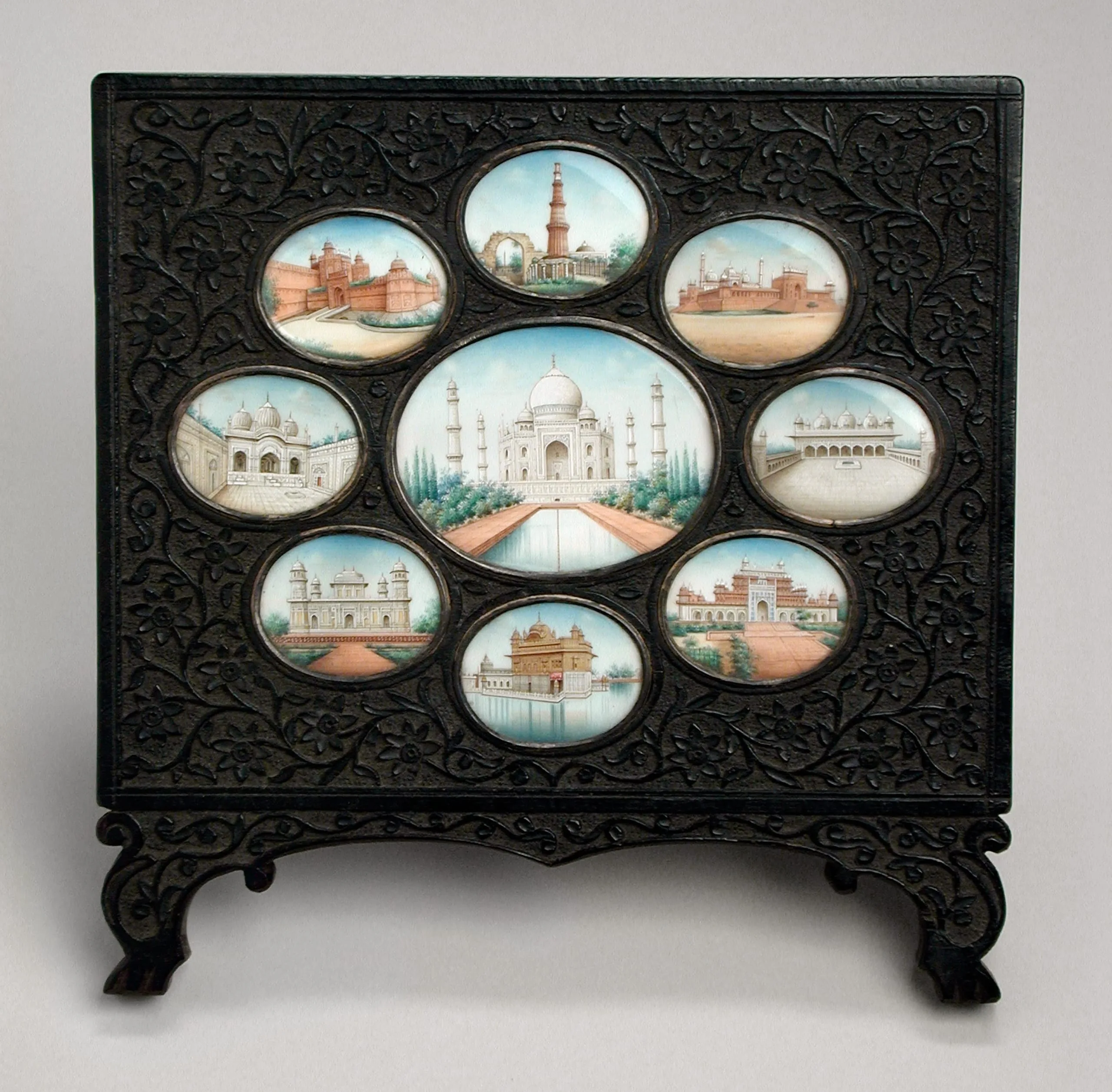 Miniature portraits on ivory of Mughal monarchs (see M.91.23) and views of Indian monuments were avidly collected by members of the East India Companies and European visitors to India beginning by the 1840s. In this group representation, nine oval architectural paintings on ivory are mounted into an ebony frame decorated with flowering vines carved in shallow relief. The Mughal-trained Indian artists who produced the architectural drawings adopted Western spatial perspective to appeal to the collecting tastes of their patrons and clients.