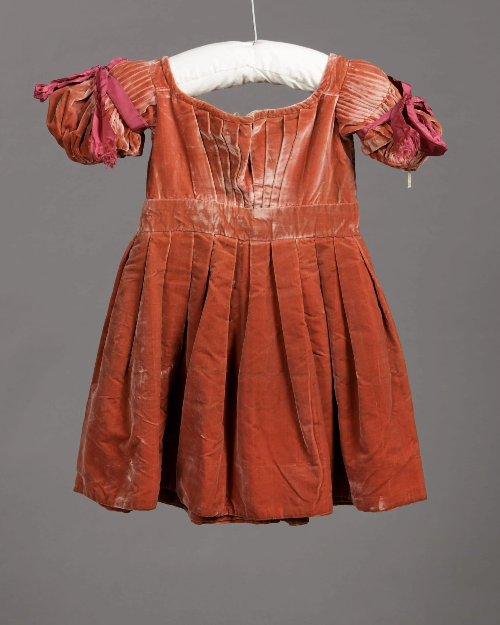 Child's terracotta velvet dress on a padded hanger, with pintucked bodice, full pleated skirt, puffed sleeves, and magenta ribbon trim at each shoulder