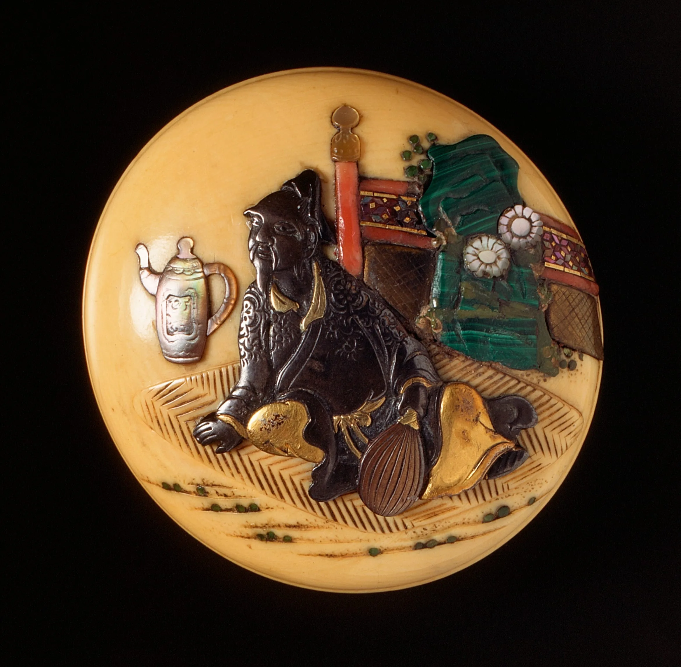 - Ivory with staining, various inlays including malachite, metal, coral, mother-of-pearl; manjū type