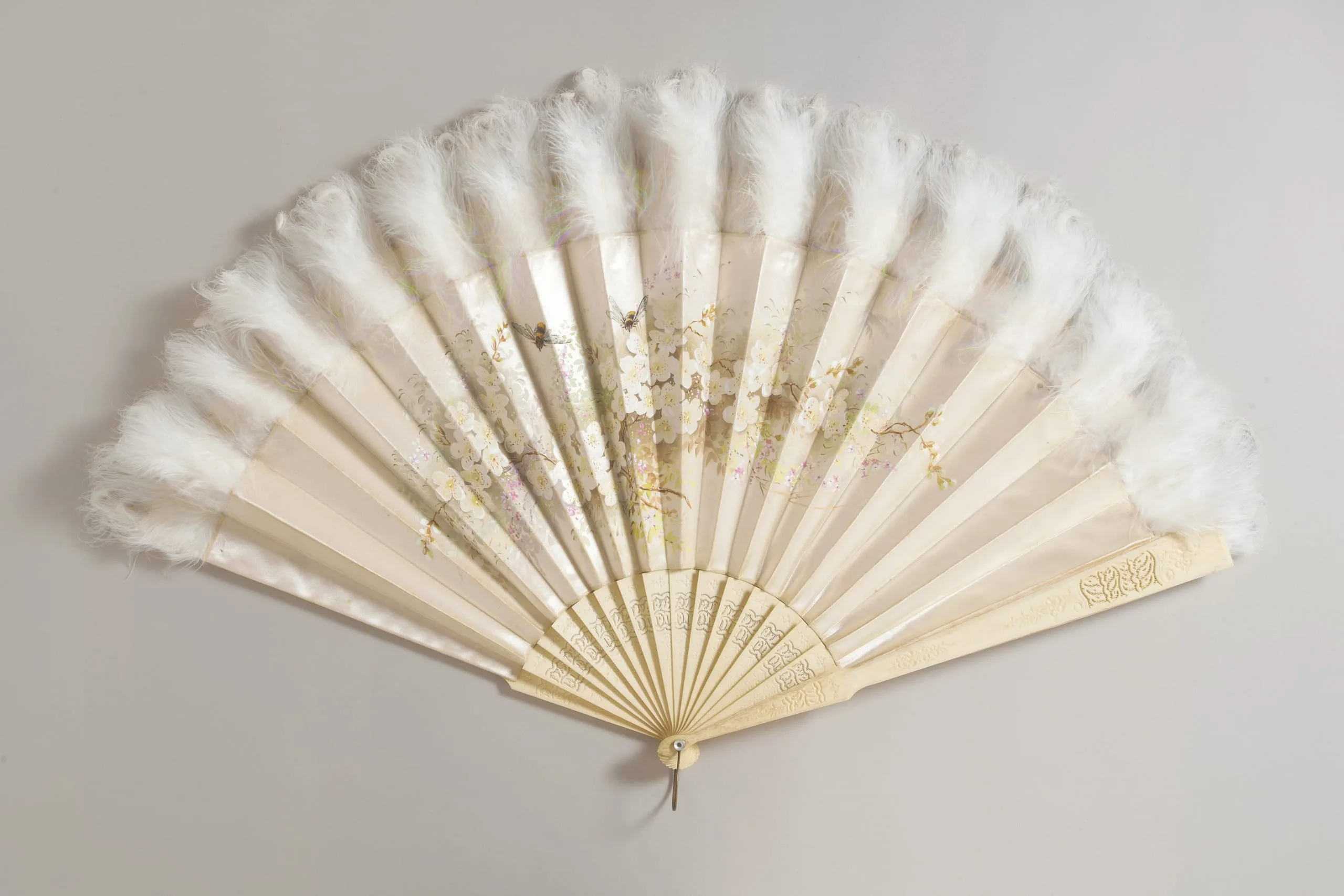 - Silk leaf with ostrich feather tips, bone sticks and guards, brass loop and rivet, mother-of-pearl button
