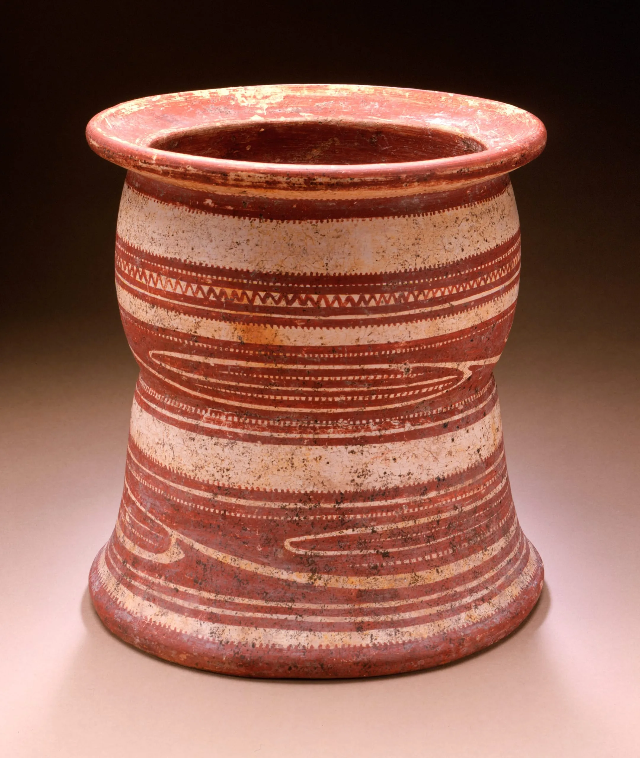 - Coil-built earthenware with cream slip and painted decoration