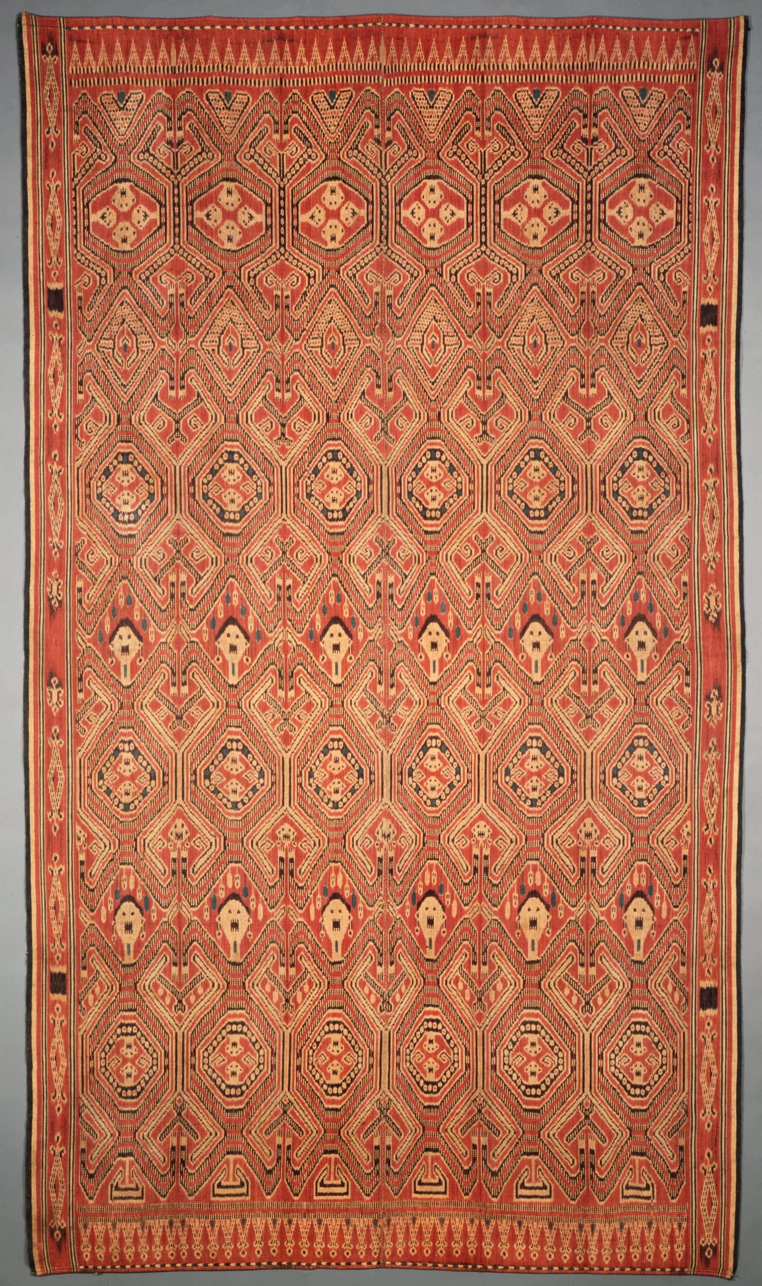 - Cotton, resist-dyed warp (ikat), warp-faced plain weave