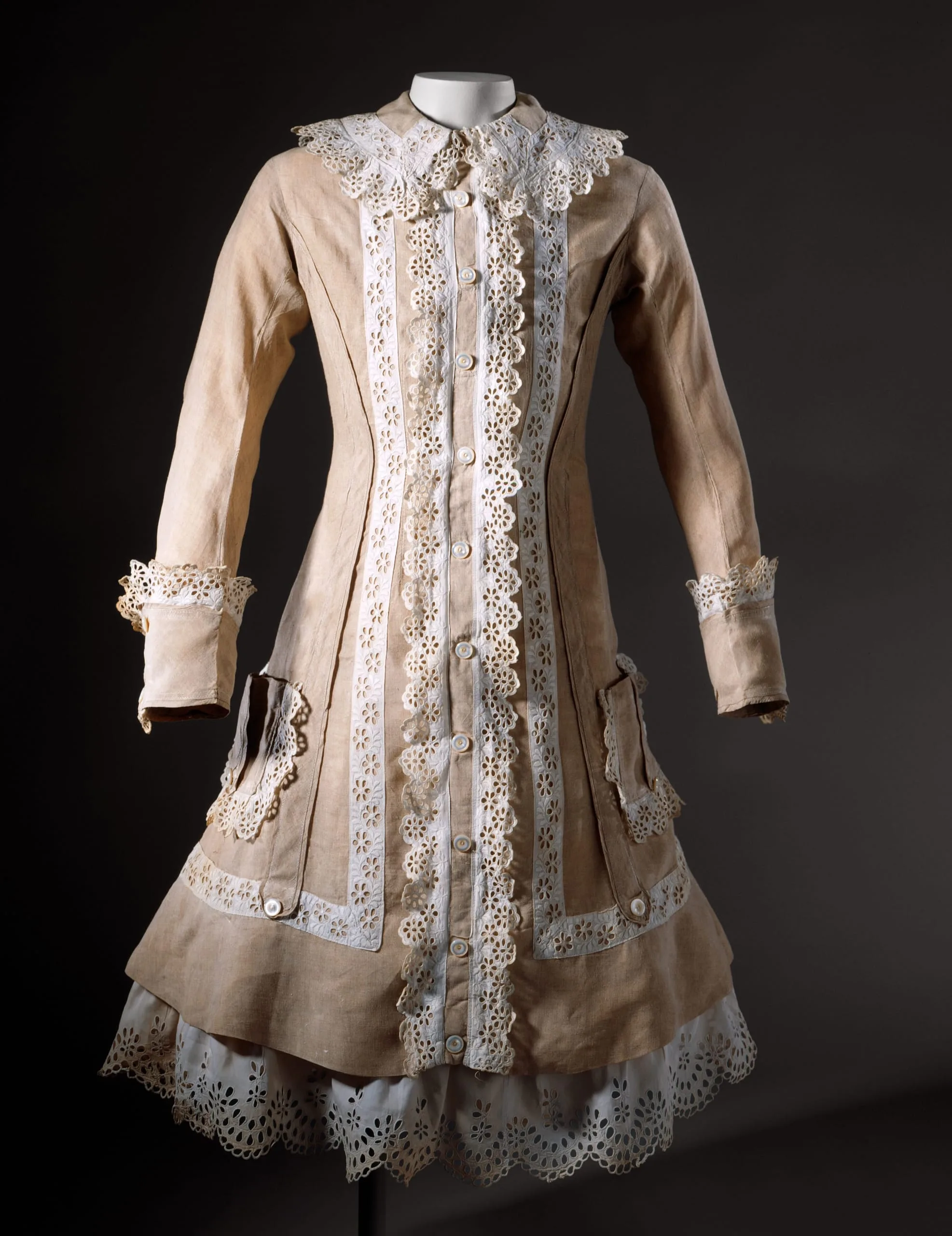 - Dress: Linen and cotton sateen and cotton plain weave with cotton cut-work embroidery (broderie anglaise)