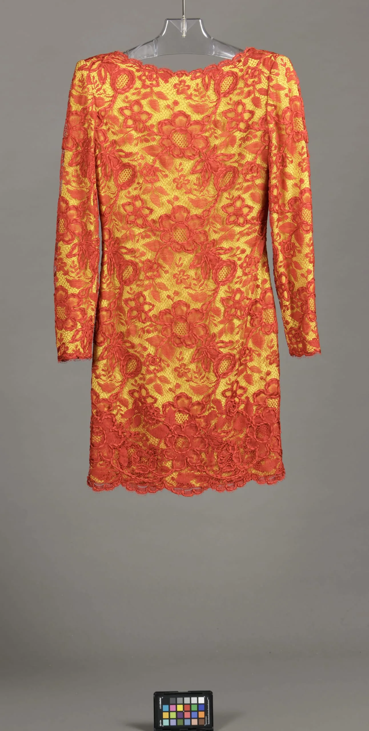 - Dress: rayon plain weave (crepe) with supplementary wrap patterning, rayon machine-made lace and rayon plain weave ribbon embroidery; Jacket: cotton damask, printed, rayon double-cloth (cloqué)