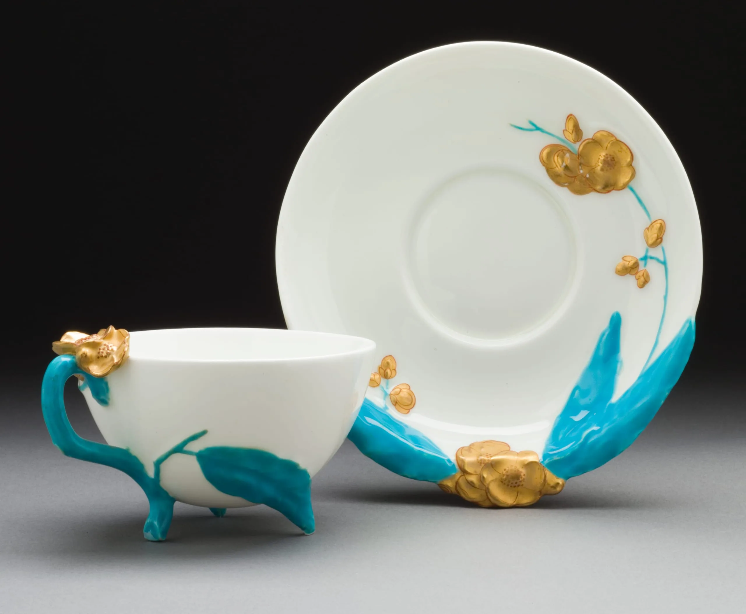 - Porcelain decorated with gilt blossoms and turquoise leaves