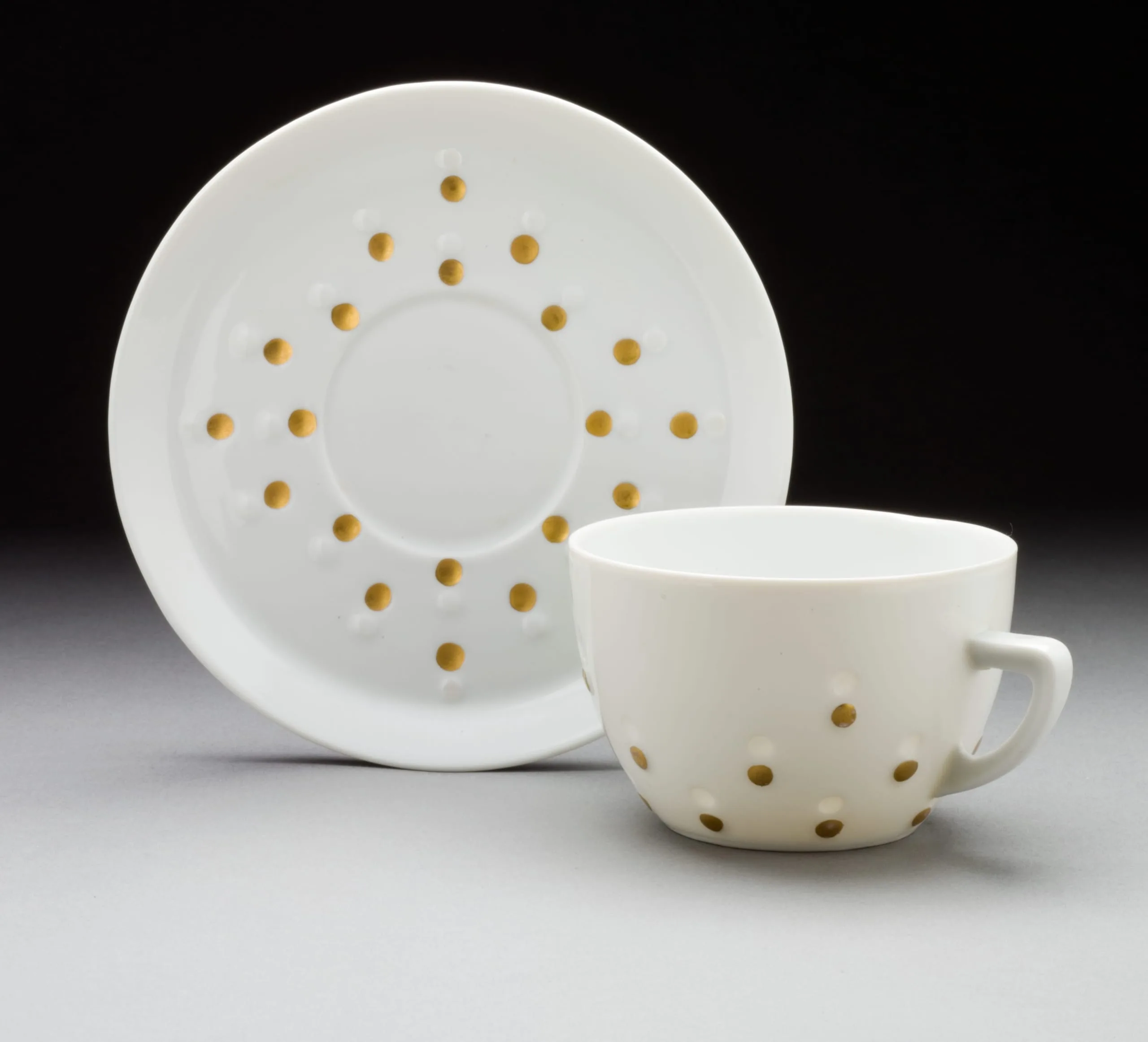 - Gold Dot Motif Teacup, Saucer, and Dessert Plate