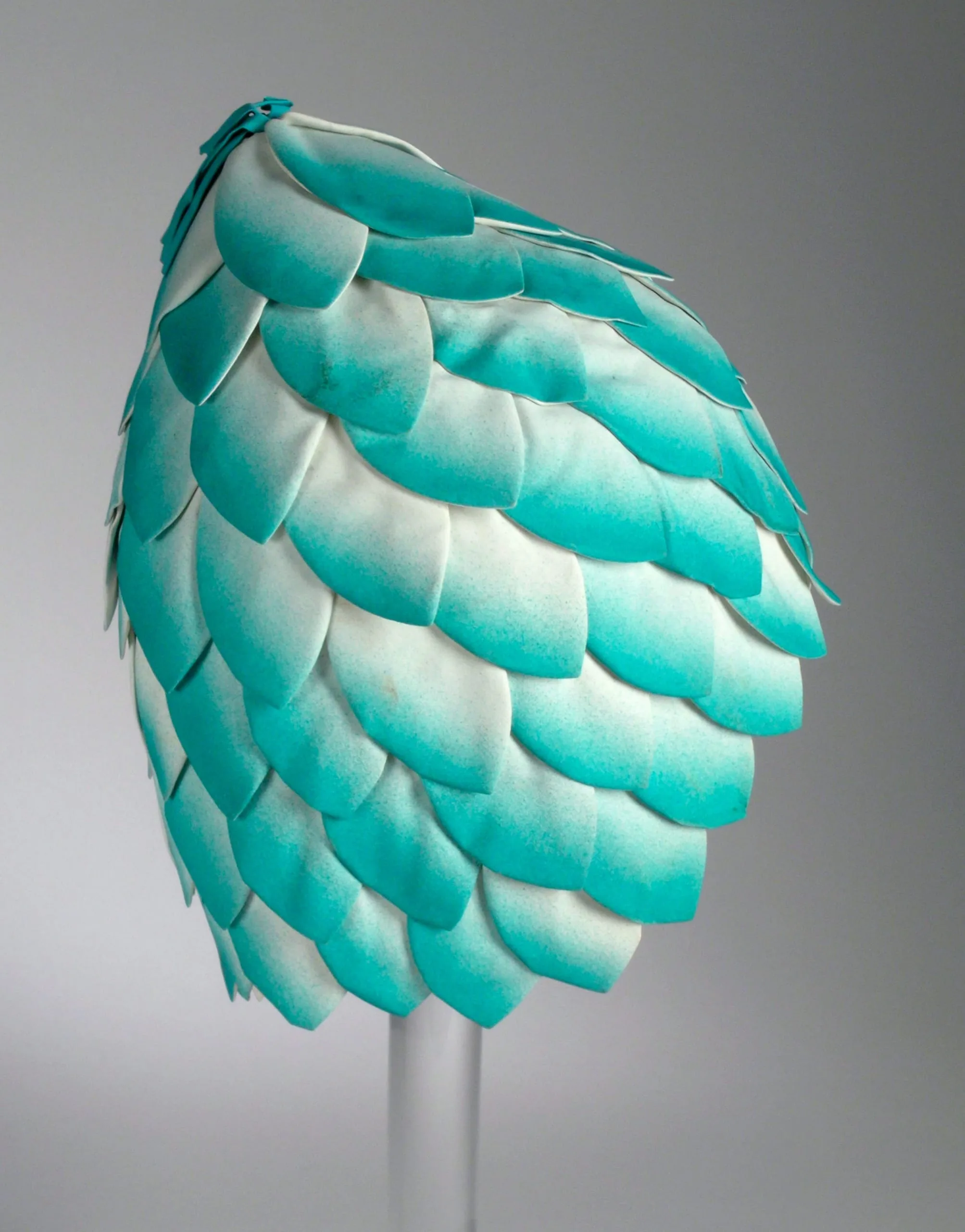Hat displayed on a white stand, dome-shaped with overlapping scale-like fabric pieces in ombré aqua turquoise fading to white at the crown