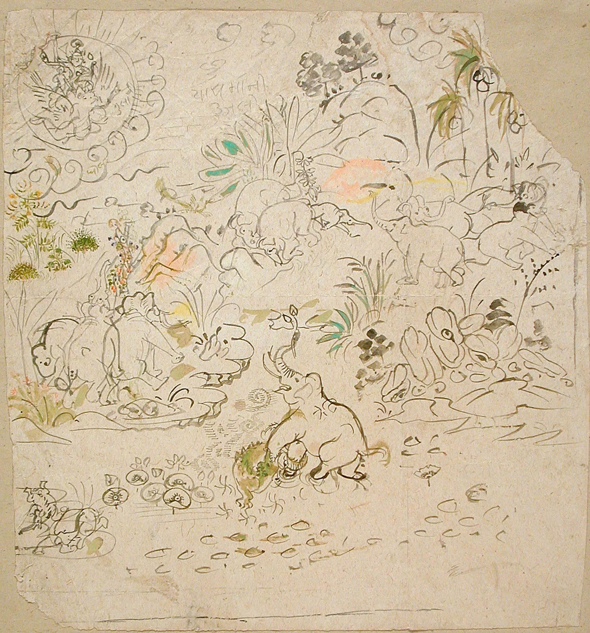 This delicately animated drawing depicts the King of the Elephants, Gajendra, being rescued by the Hindu God of Preservation, Vishnu, riding on his avian mount, Garuda. The popular tale is told in the Bhagavata Purana (Ancient Stories of the Lord), which is traditionally ascribed to the legendary poet-sage Vyasa in the 8th-10th century CE.