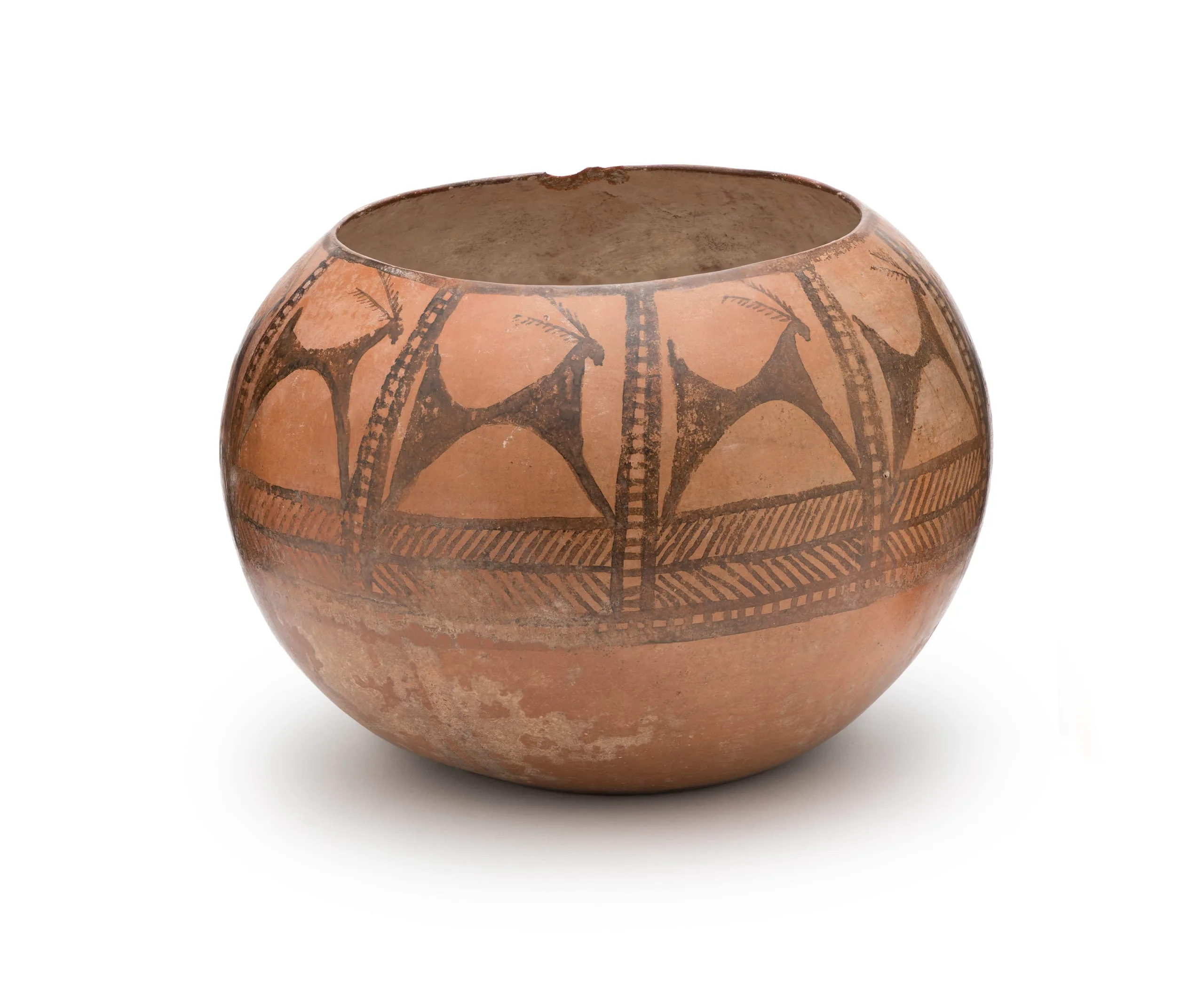 Two painted vessels from the Tehran-Qazvin region in central Iran are the earliest ceramics in LACMA's collection of art of the ancient Near East; they are also the oldest ceramic vessels in the museum's collections overall. One of the vessels, shown here, is probably from the well-known prehistoric site of Tepe Mushalan, a settlement from the late fifth millennium BC, near the village of Esmailbad. Excavations in the 1950s revealed a large quantity of the Esmailbad painted pottery, called Esmailbad ware. The black-on-red pottery of this ancient period is extremely fine, and exemplars have come from excavations of the sites at Rey and Silak, and the Qazvin Plain. The decorative motifs were inspired by the artistic tradition of the Iranian Plateau. The motif seen here is of ibexes and goats framed in geometric designs.