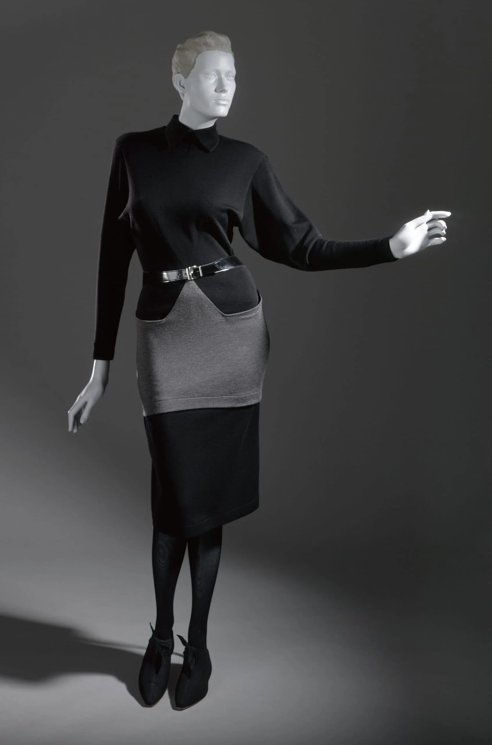 - Dress: Wool knit. Attached belt: vinyl, metal